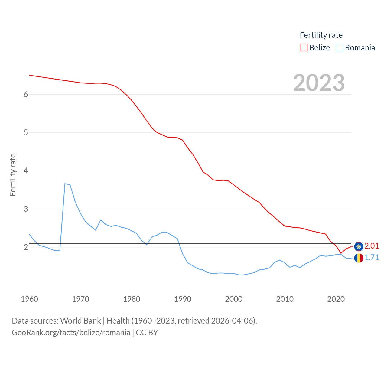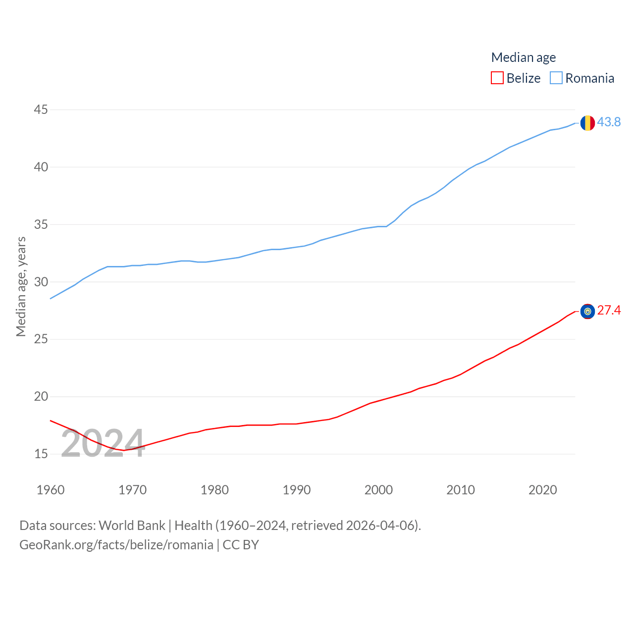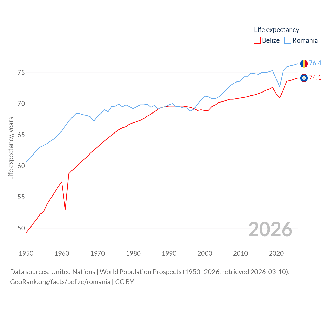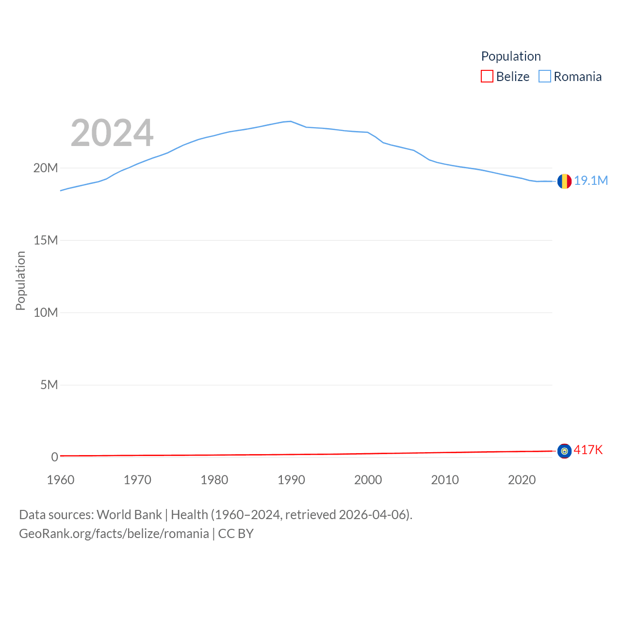 Belize has a population of 417K (ranked 171/197), compared with 19.1M in Romania (ranked 67/197). Belize's land area is 8,807 sq mi versus 88,834 sq mi for Romania (ranked 148th vs. 80th).