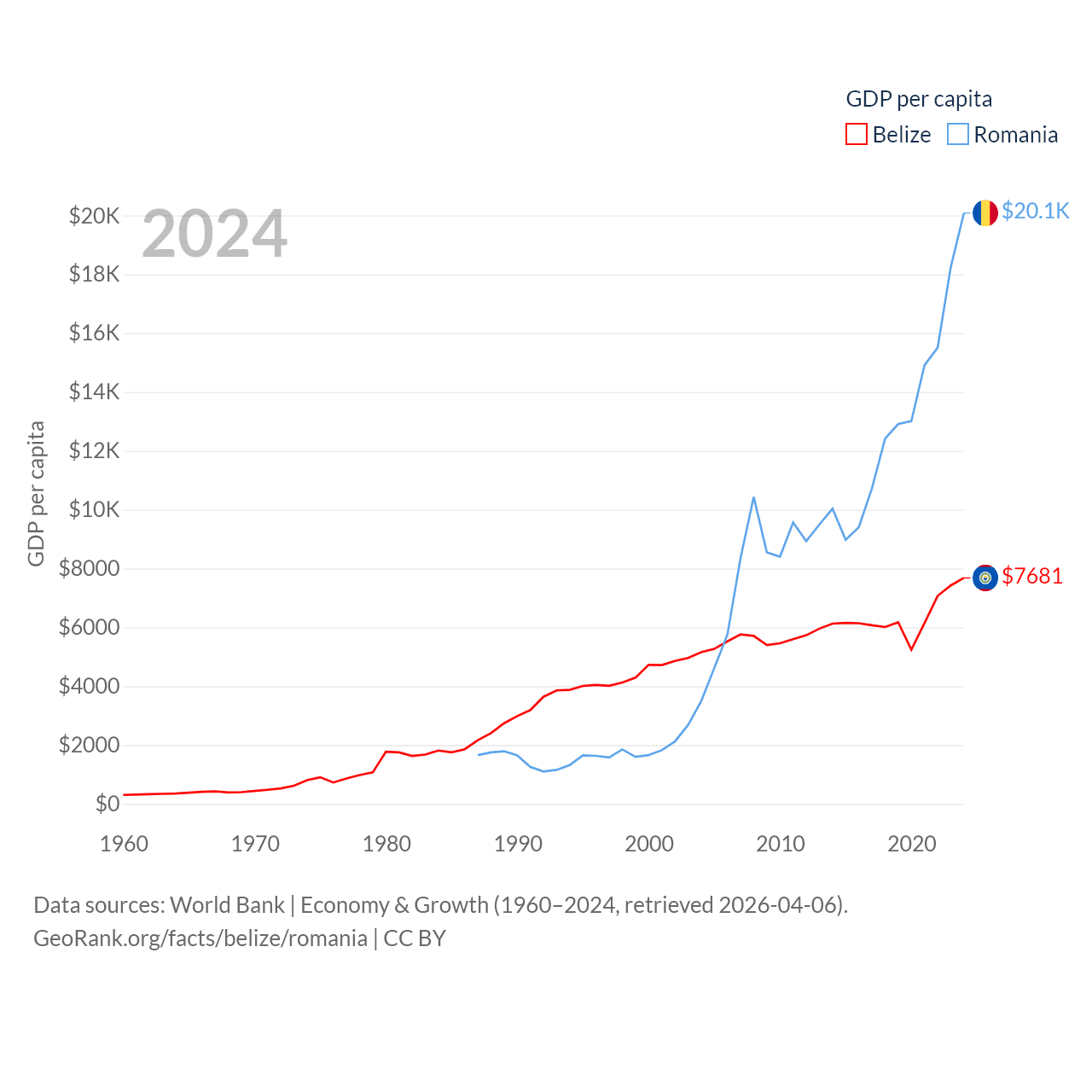 By GDP, Belize ranks 168/197 ($3.2B) and Romania ranks 42/197 ($383B). By GDP per capita, Belize ranks 98/197 ($7,681), while Romania ranks 58/197 ($20,080).