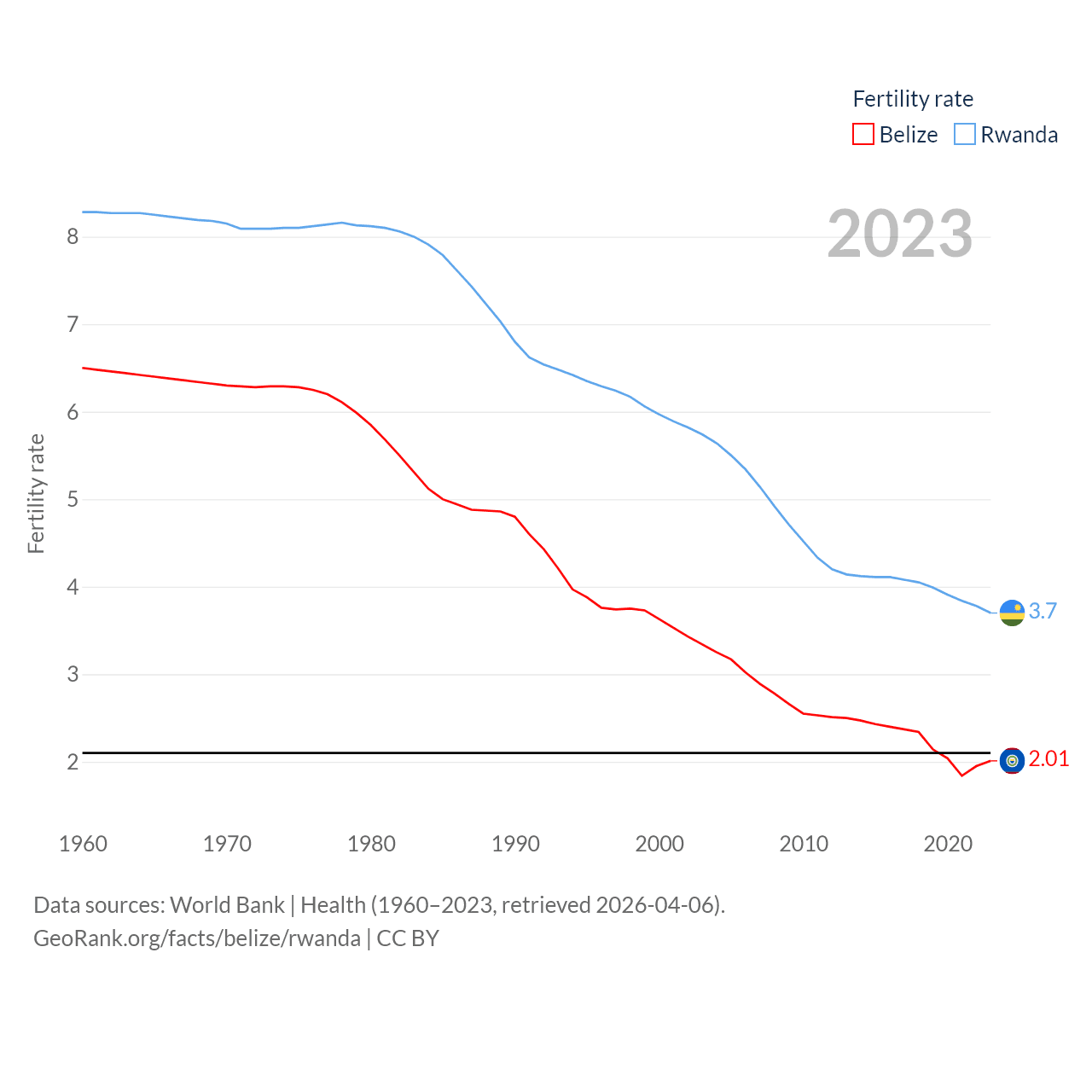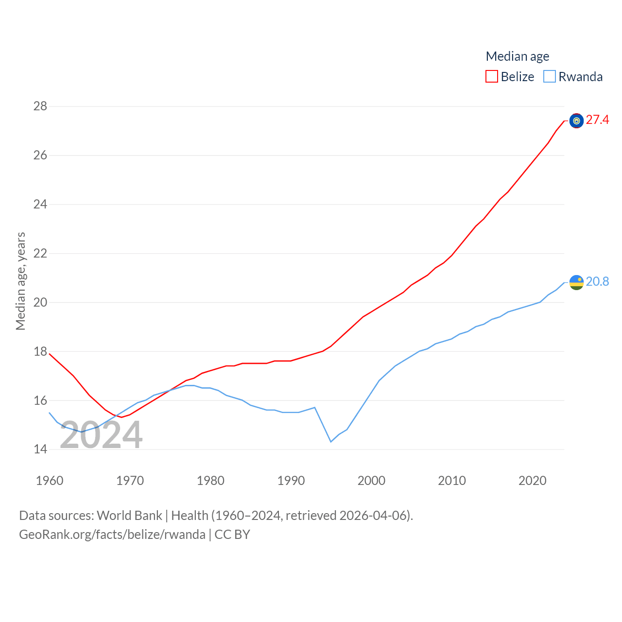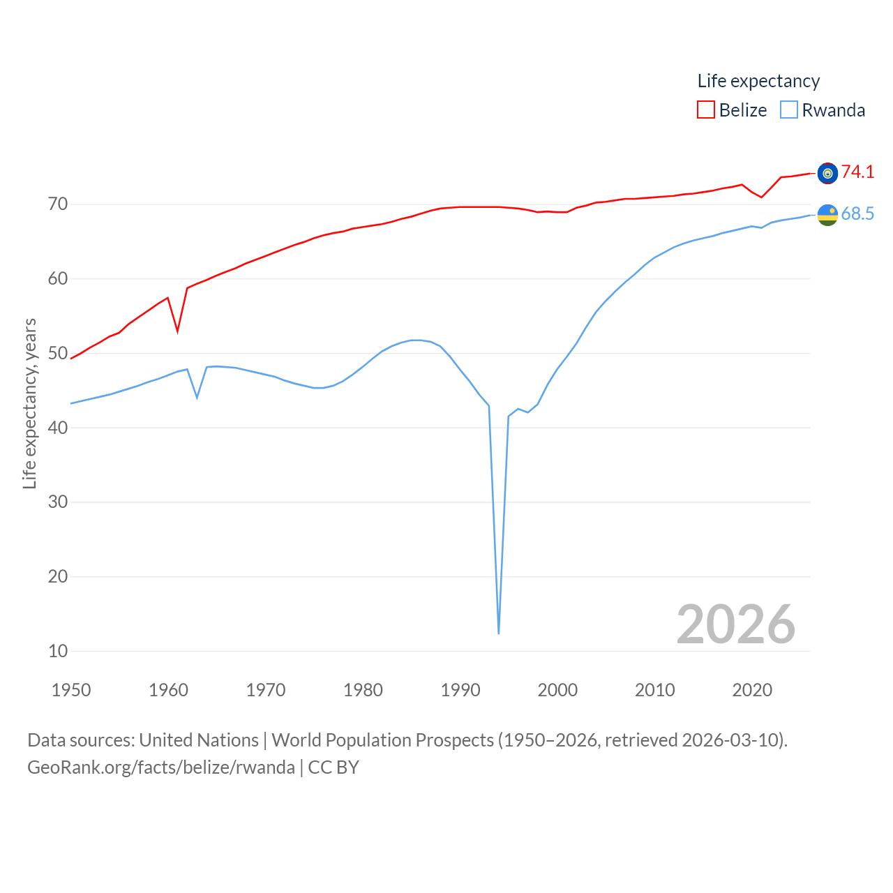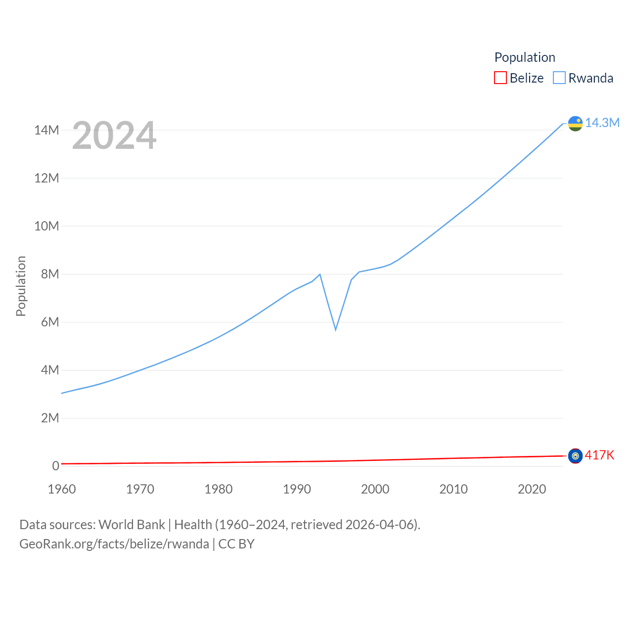 Belize has a population of 417K (ranked 171/197), compared with 14.3M in Rwanda (ranked 77/197). Belize's land area is 8,807 sq mi versus 9,525 sq mi for Rwanda (ranked 148th vs. 146th).