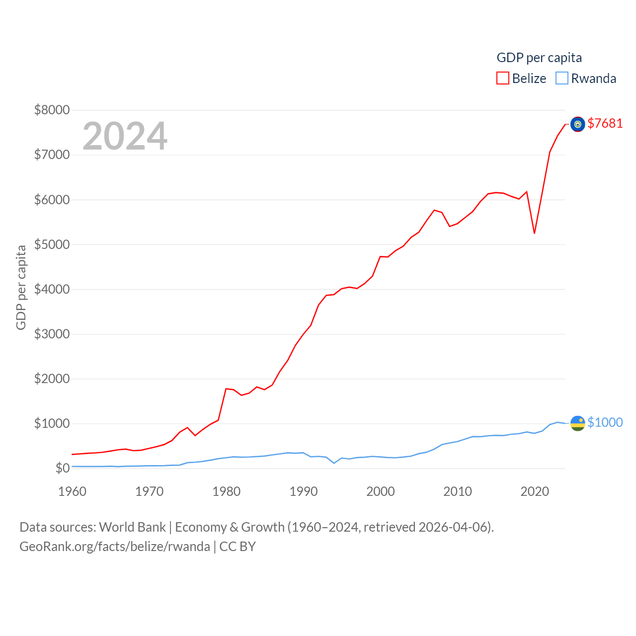 By GDP, Belize ranks 168/197 ($3.2B) and Rwanda ranks 144/197 ($14.3B). By GDP per capita, Belize ranks 98/197 ($7,681), while Rwanda ranks 178/197 ($1,000).