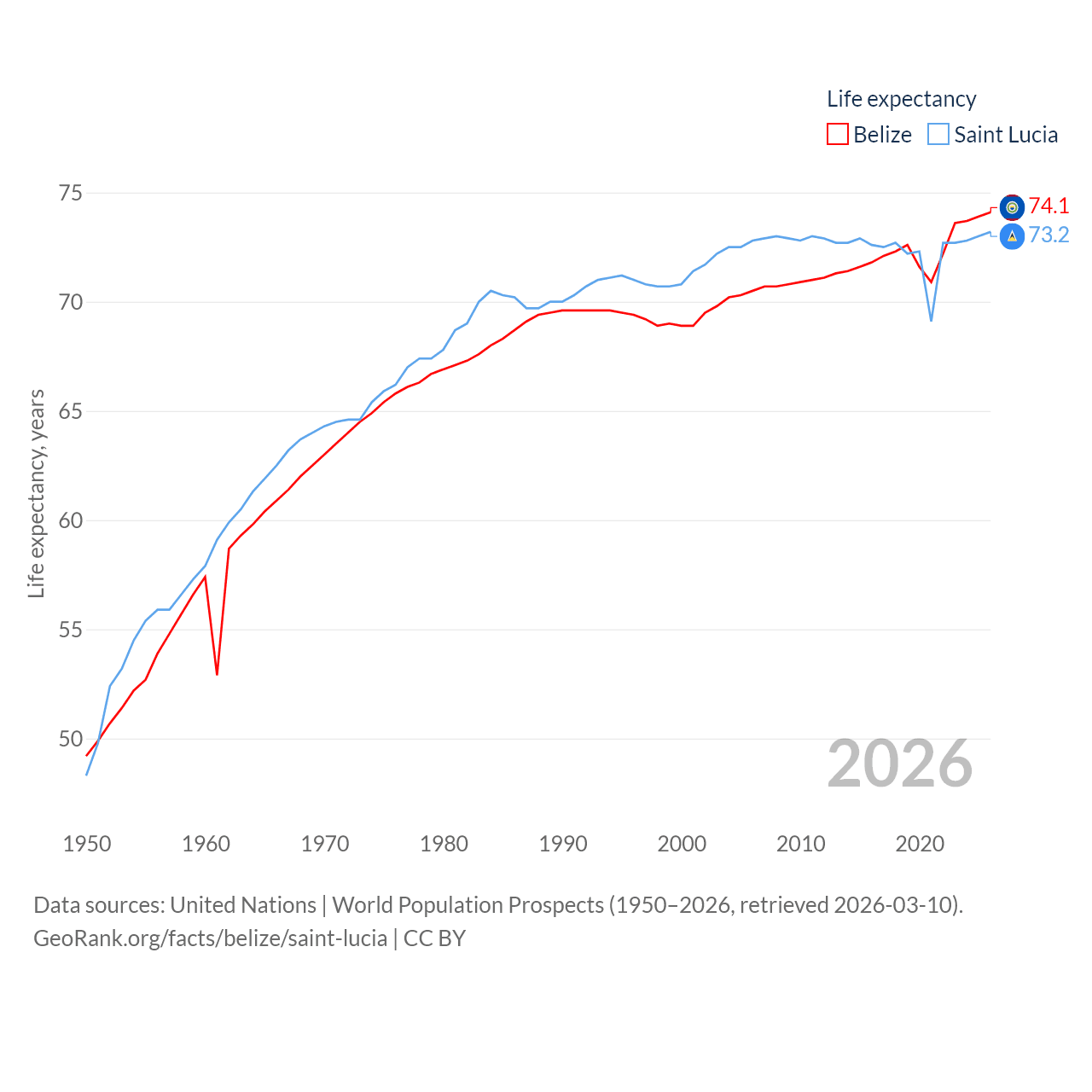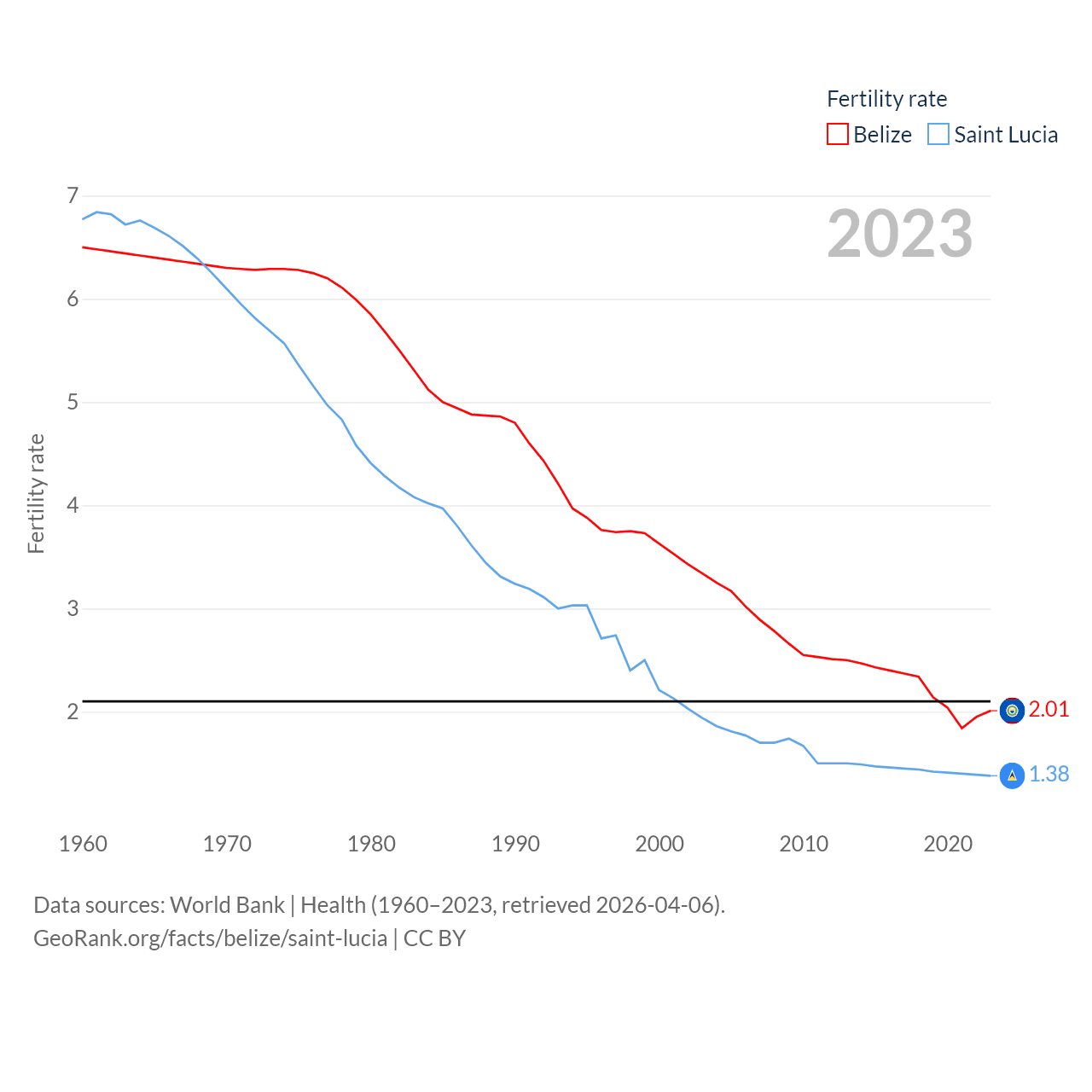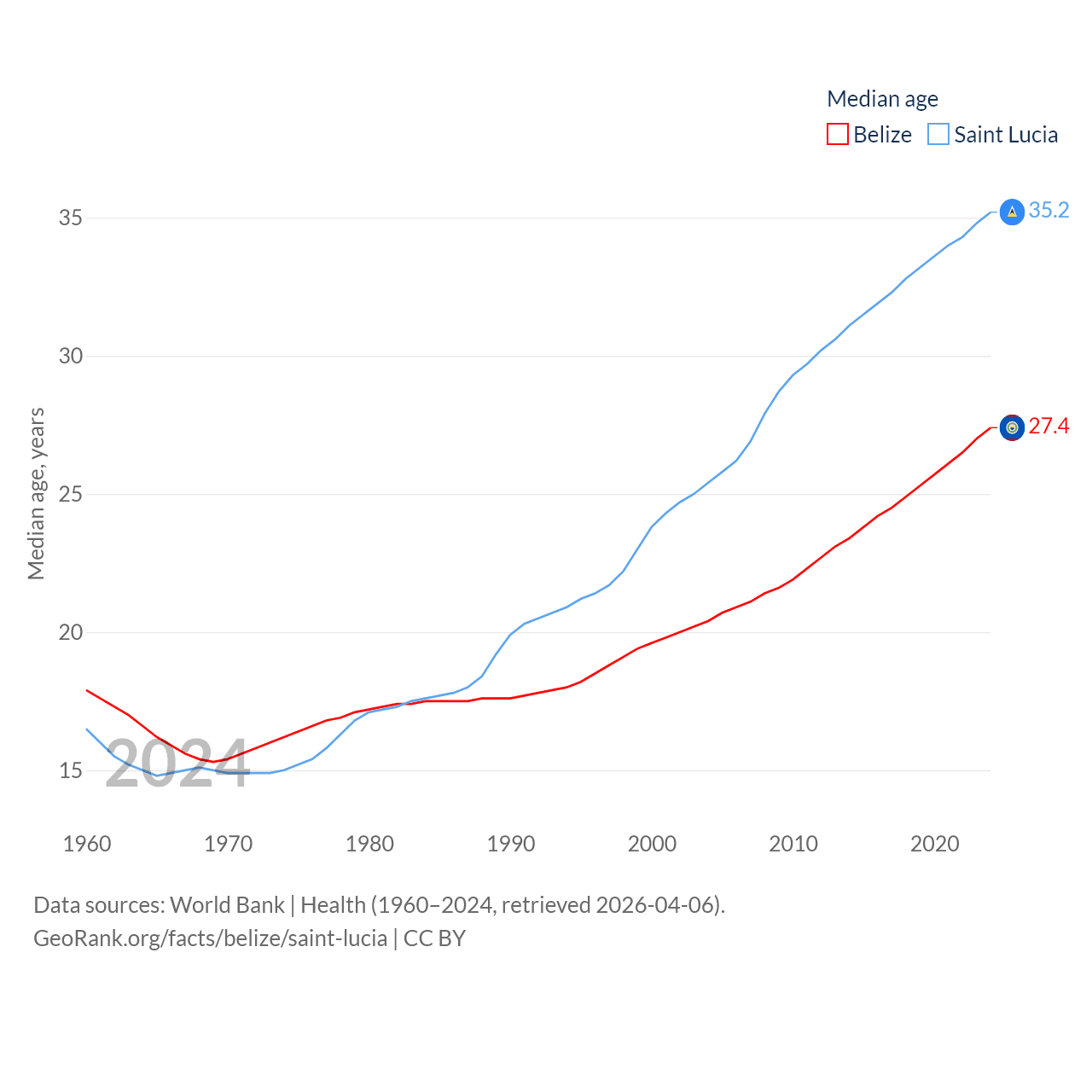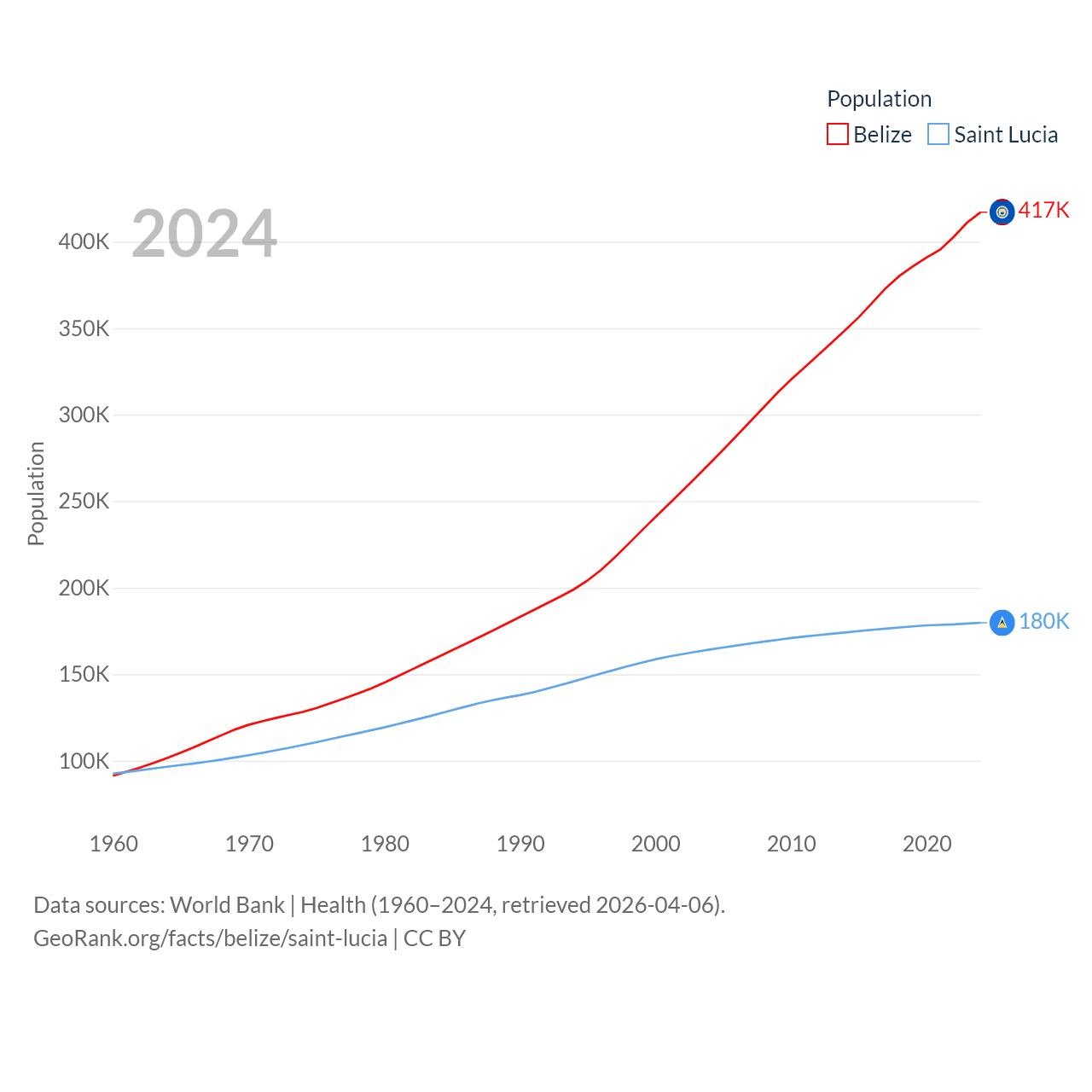 Belize has a population of 417K (ranked 171/197), compared with 180K in Saint Lucia (ranked 178/197). Belize's land area is 8,807 sq mi versus 235.5 sq mi for Saint Lucia (ranked 148th vs. 178th).
