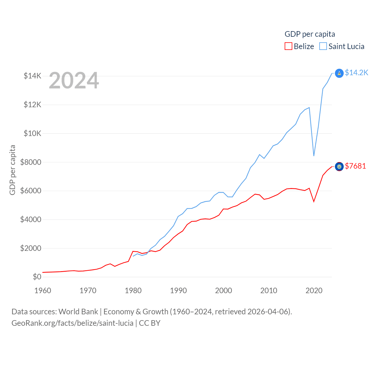By GDP, Belize ranks 168/197 ($3.2B) and Saint Lucia ranks 173/197 ($2.55B). By GDP per capita, Belize ranks 98/197 ($7,681), while Saint Lucia ranks 70/197 ($14,182).