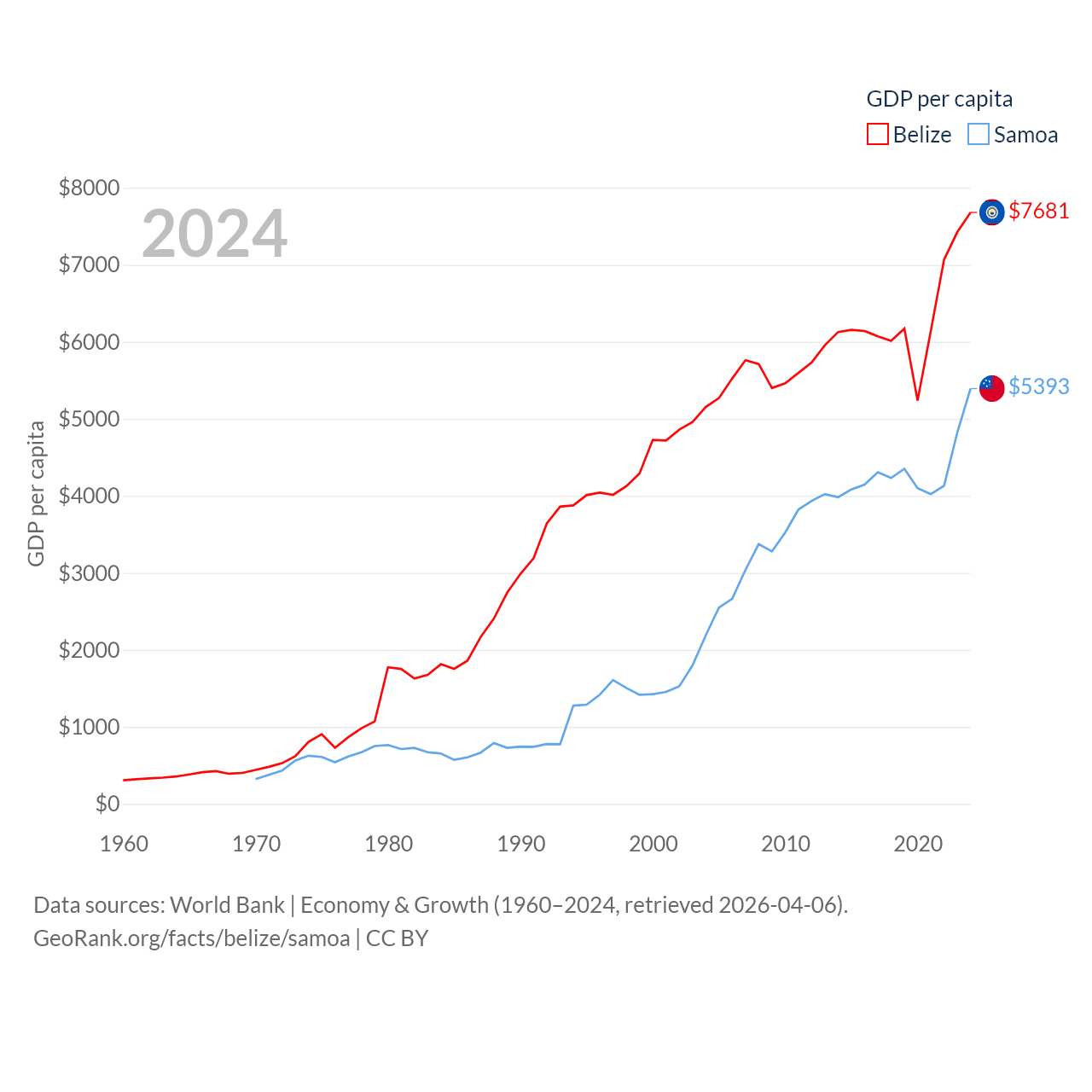By GDP, Belize ranks 168/197 ($3.2B) and Samoa ranks 185/197 ($1.18B). By GDP per capita, Belize ranks 98/197 ($7,681), while Samoa ranks 117/197 ($5,393).