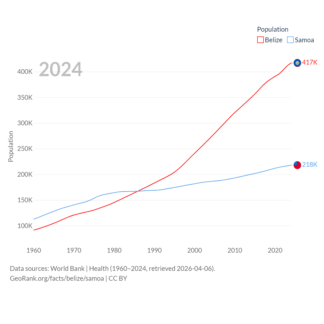 Belize has a population of 417K (ranked 171/197), compared with 218K in Samoa (ranked 177/197). Belize's land area is 8,807 sq mi versus 1,073 sq mi for Samoa (ranked 148th vs. 168th).