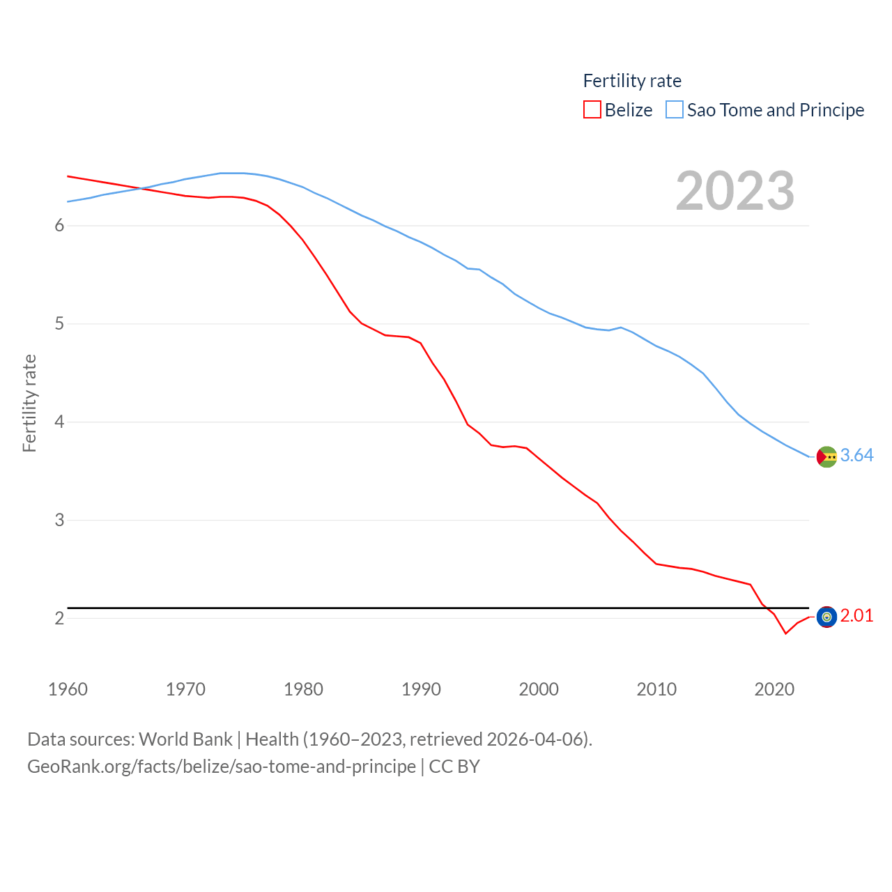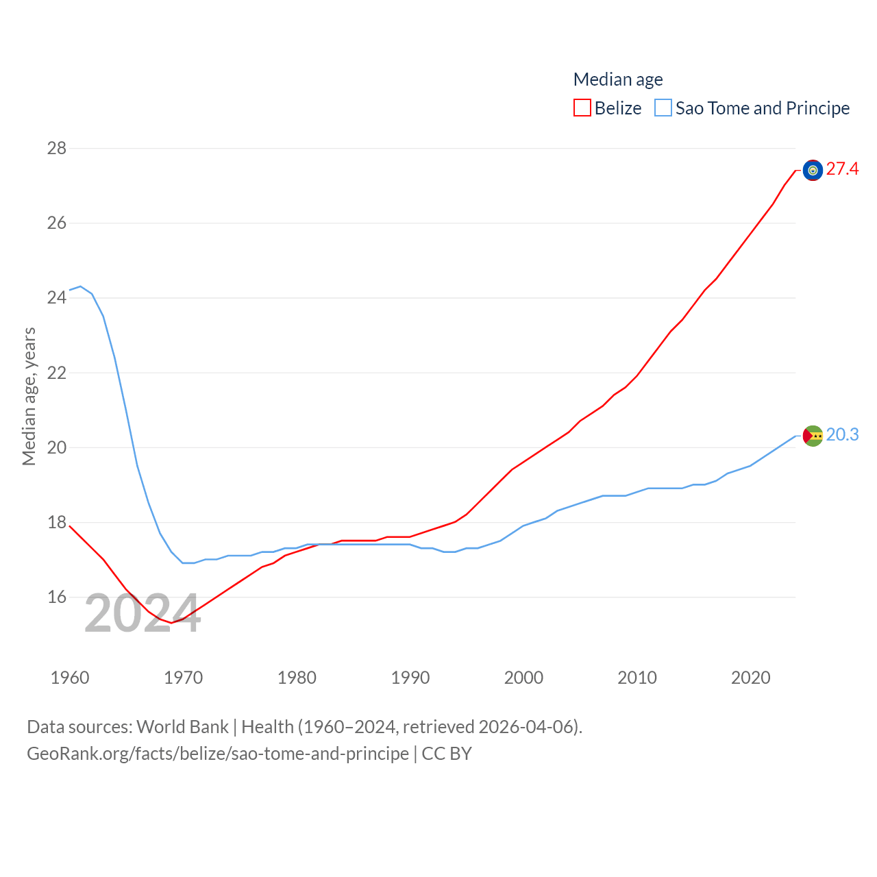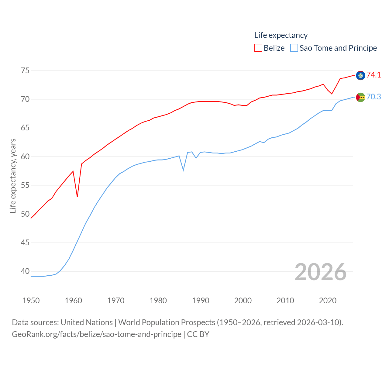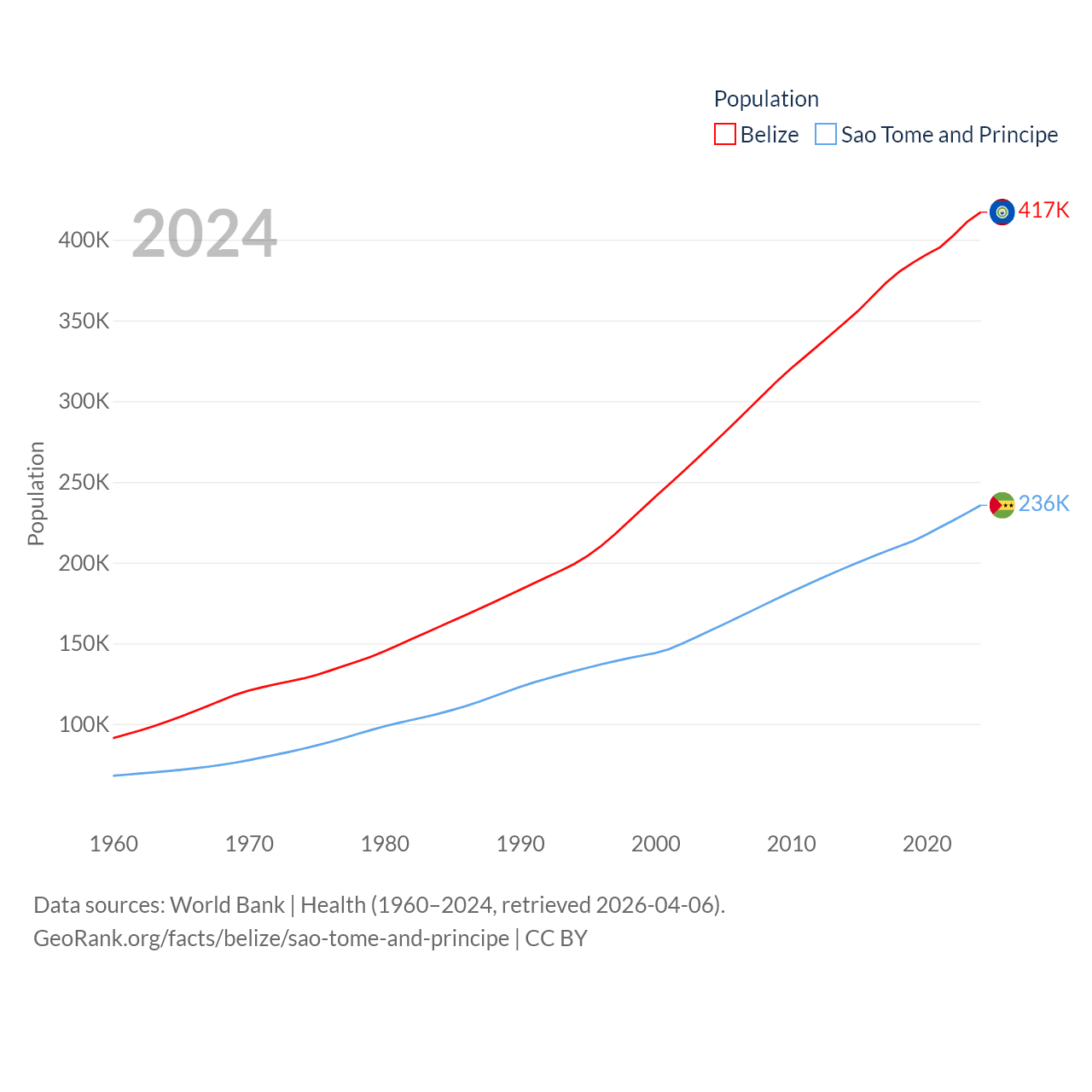 Belize has a population of 417K (ranked 171/197), compared with 236K in Sao Tome and Principe (ranked 176/197). Belize's land area is 8,807 sq mi versus 371 sq mi for Sao Tome and Principe (ranked 148th vs. 172nd).