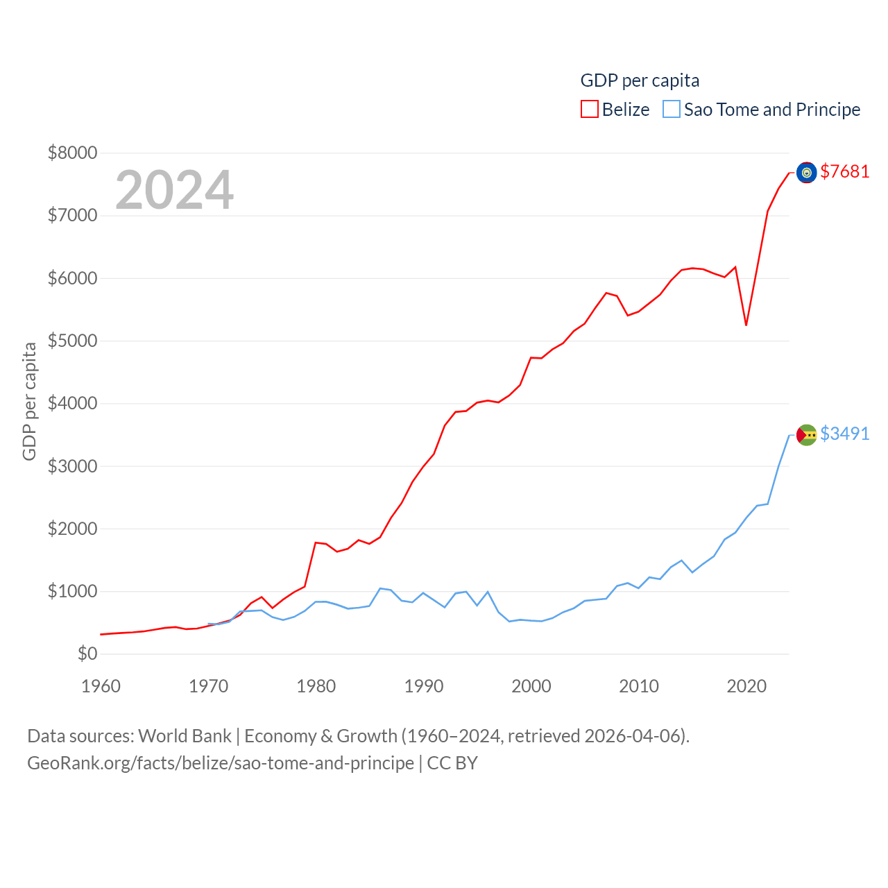 By GDP, Belize ranks 168/197 ($3.2B) and Sao Tome and Principe ranks 189/197 ($822M). By GDP per capita, Belize ranks 98/197 ($7,681), while Sao Tome and Principe ranks 134/197 ($3,491).