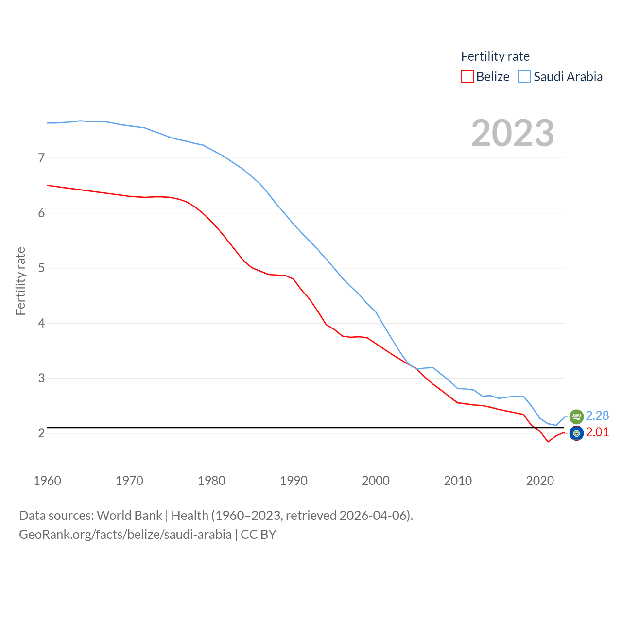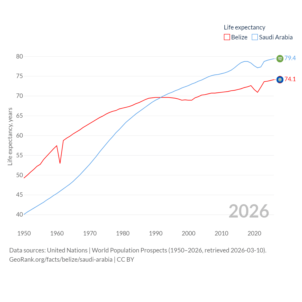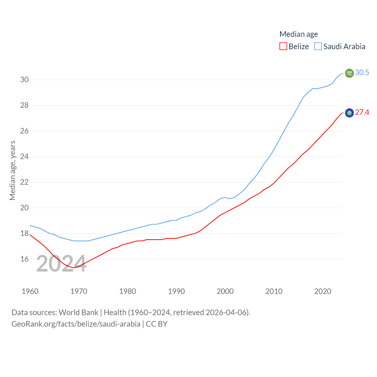 Belize has a population of 417K (ranked 171/197), compared with 35.3M in Saudi Arabia (ranked 45/197). Belize's land area is 8,807 sq mi versus 830,000 sq mi for Saudi Arabia (ranked 148th vs. 12th).