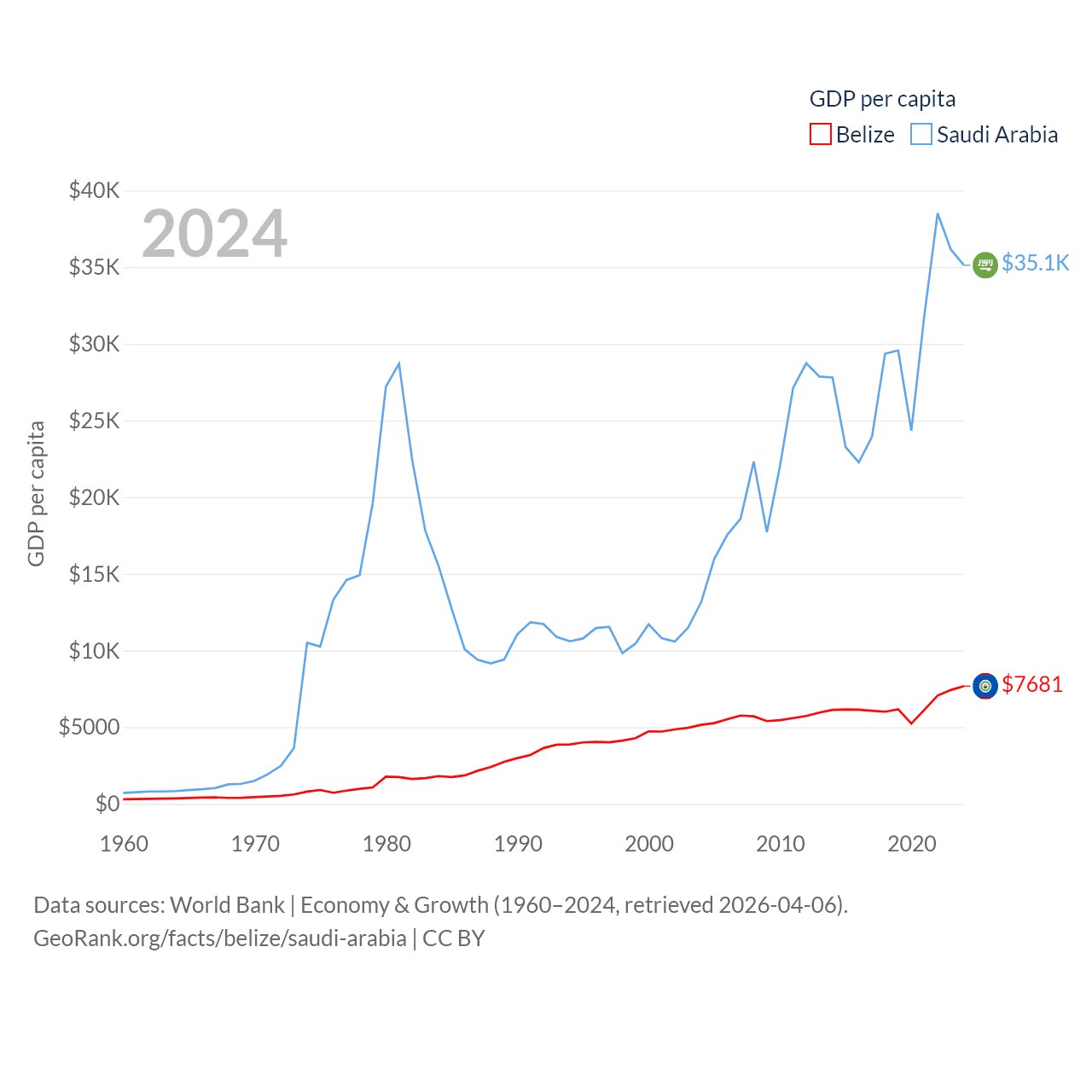 By GDP, Belize ranks 168/197 ($3.2B) and Saudi Arabia ranks 18/197 ($1.24T). By GDP per capita, Belize ranks 98/197 ($7,681), while Saudi Arabia ranks 33/197 ($35,122).