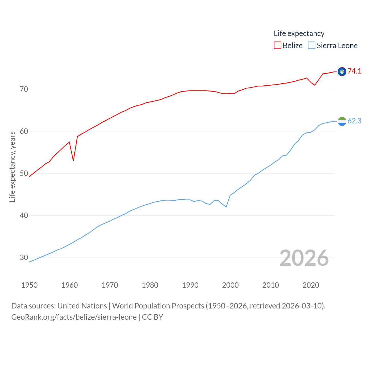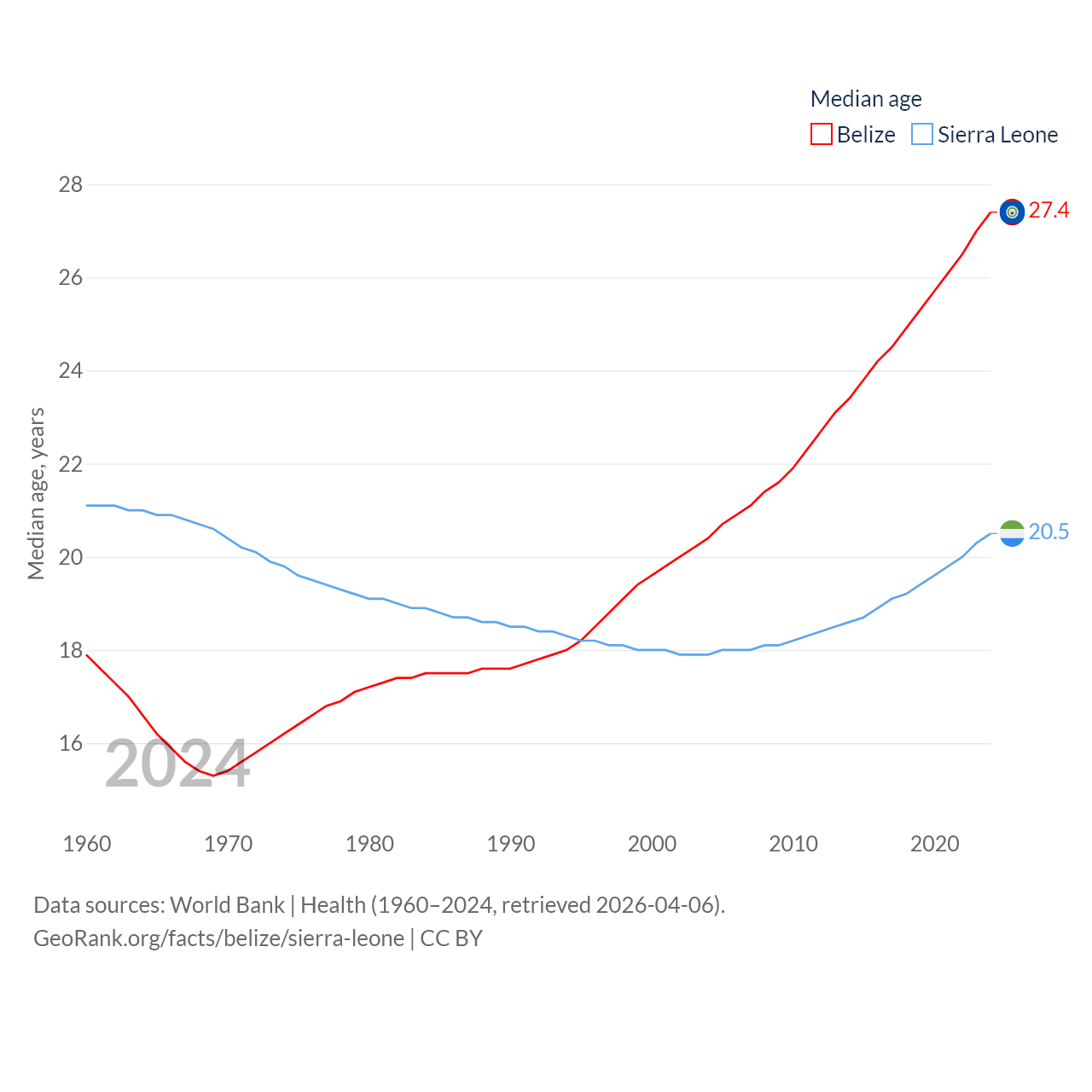 Belize has a population of 417K (ranked 171/197), compared with 8.64M in Sierra Leone (ranked 102/197). Belize's land area is 8,807 sq mi versus 27,869 sq mi for Sierra Leone (ranked 148th vs. 116th).
