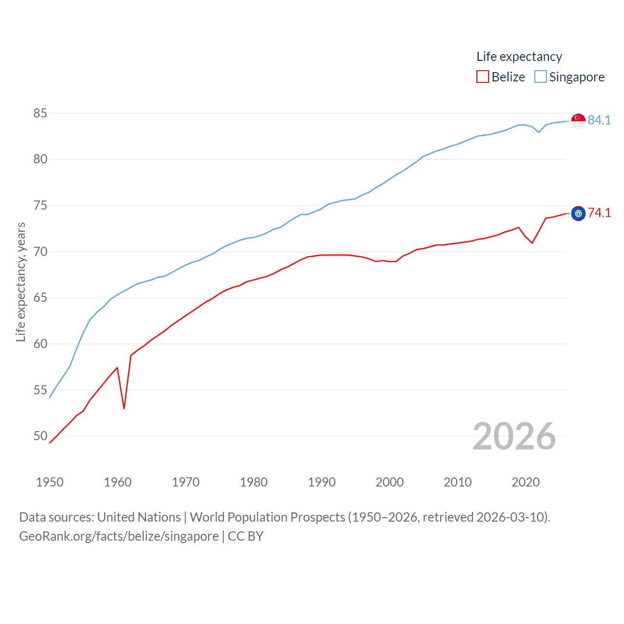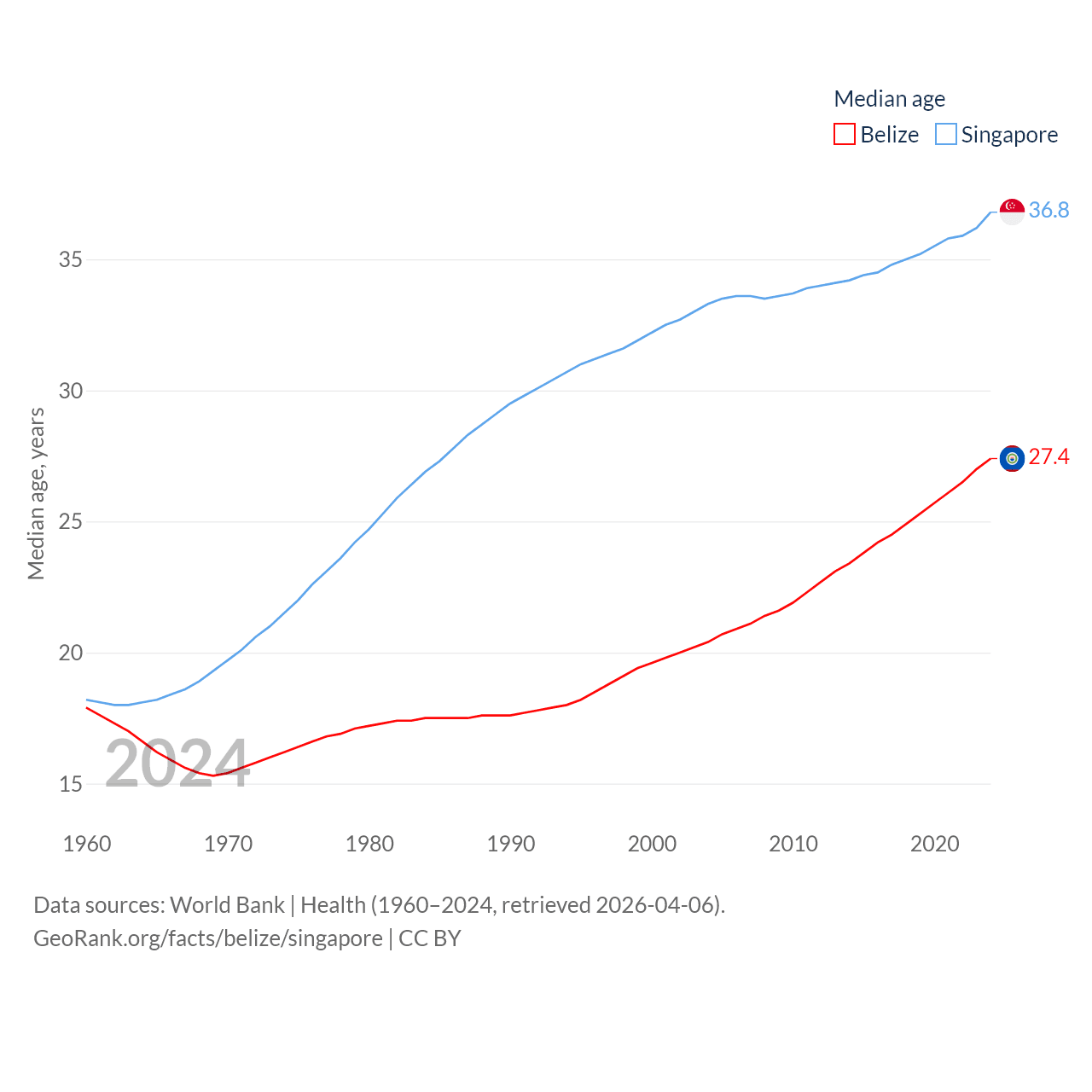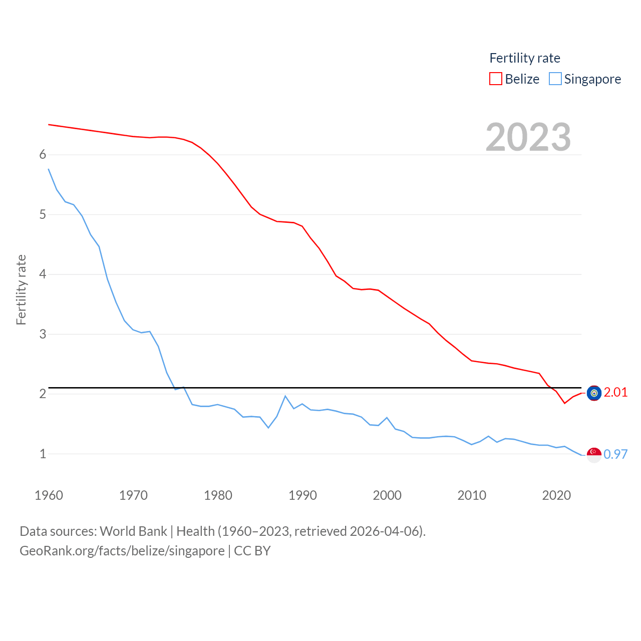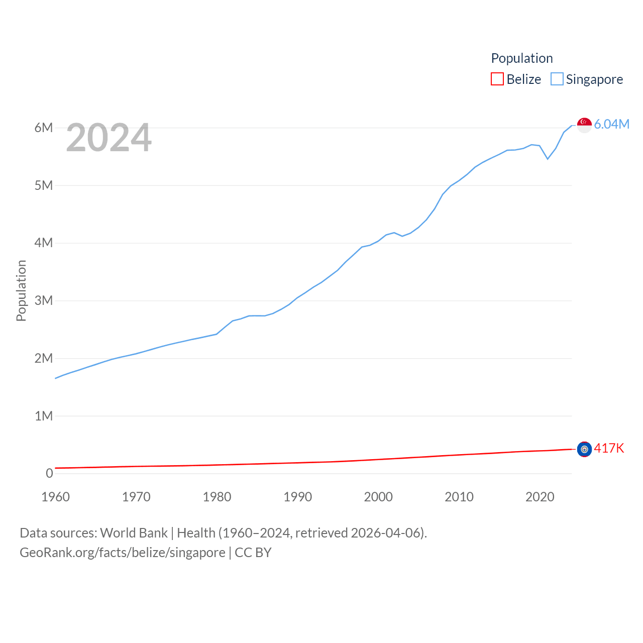 Belize has a population of 417K (ranked 171/197), compared with 6.04M in Singapore (ranked 113/197). Belize's land area is 8,807 sq mi versus 277.2 sq mi for Singapore (ranked 148th vs. 177th).
