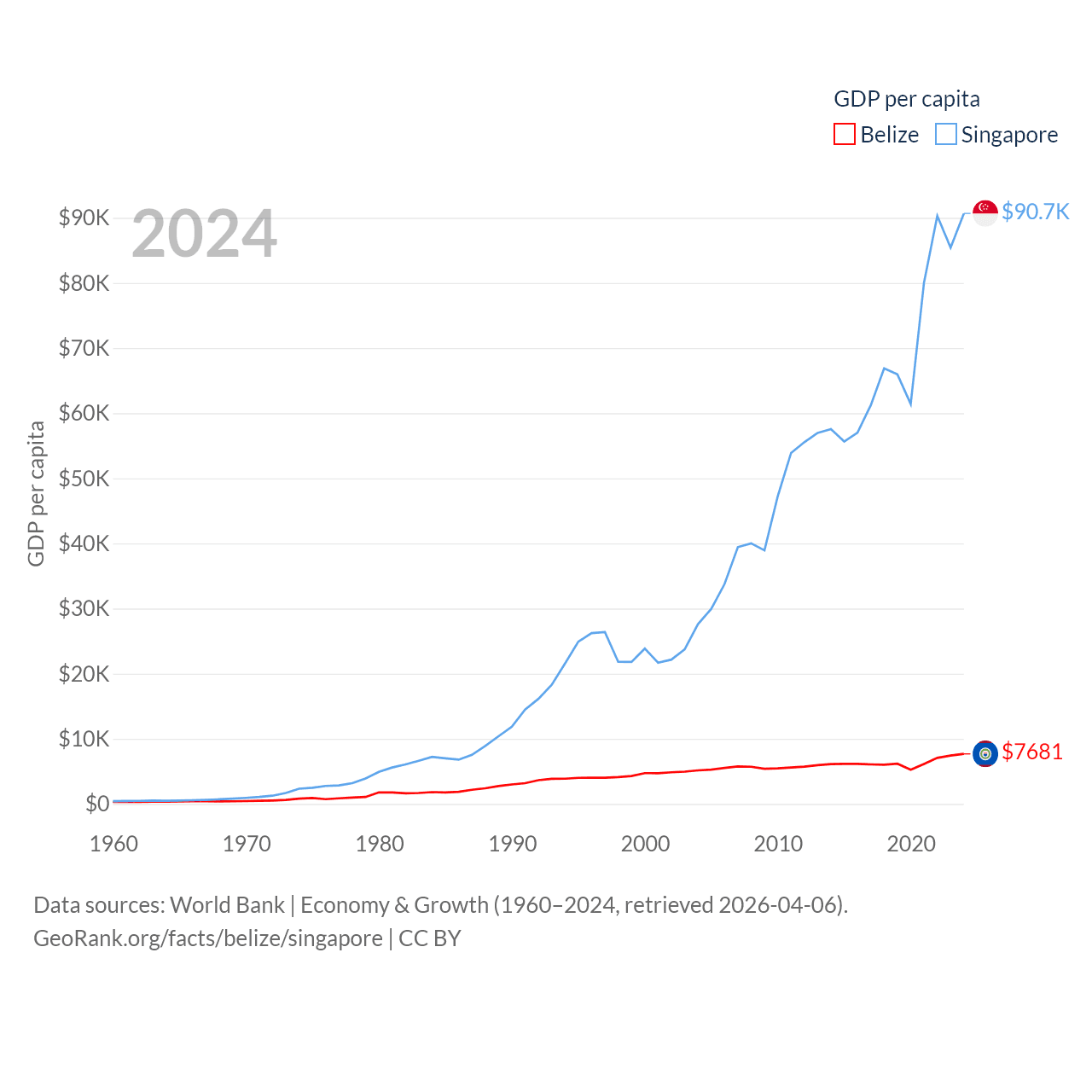 By GDP, Belize ranks 168/197 ($3.2B) and Singapore ranks 28/197 ($547B). By GDP per capita, Belize ranks 98/197 ($7,681), while Singapore ranks 7/197 ($90,674).
