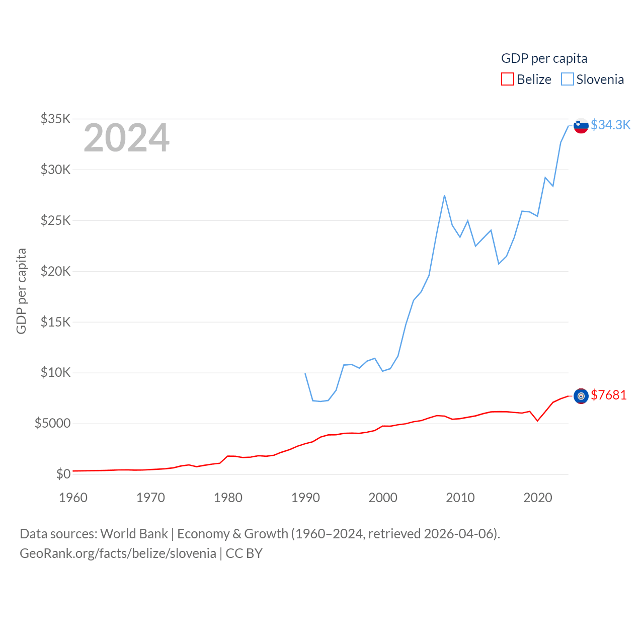 By GDP, Belize ranks 168/197 ($3.2B) and Slovenia ranks 86/197 ($73B). By GDP per capita, Belize ranks 98/197 ($7,681), while Slovenia ranks 34/197 ($34,301).