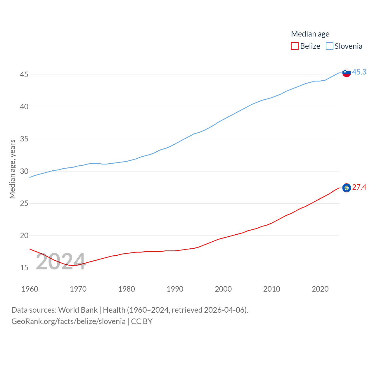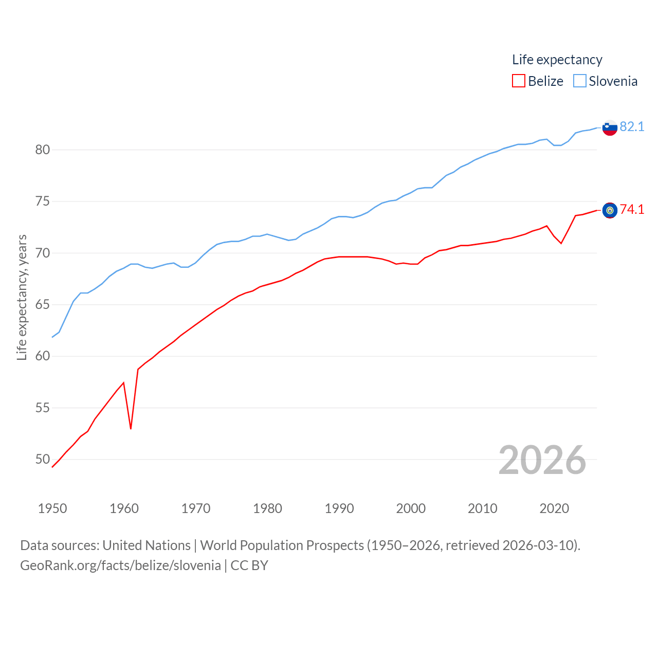 Belize has a population of 417K (ranked 171/197), compared with 2.13M in Slovenia (ranked 147/197). Belize's land area is 8,807 sq mi versus 7,774 sq mi for Slovenia (ranked 148th vs. 151st).