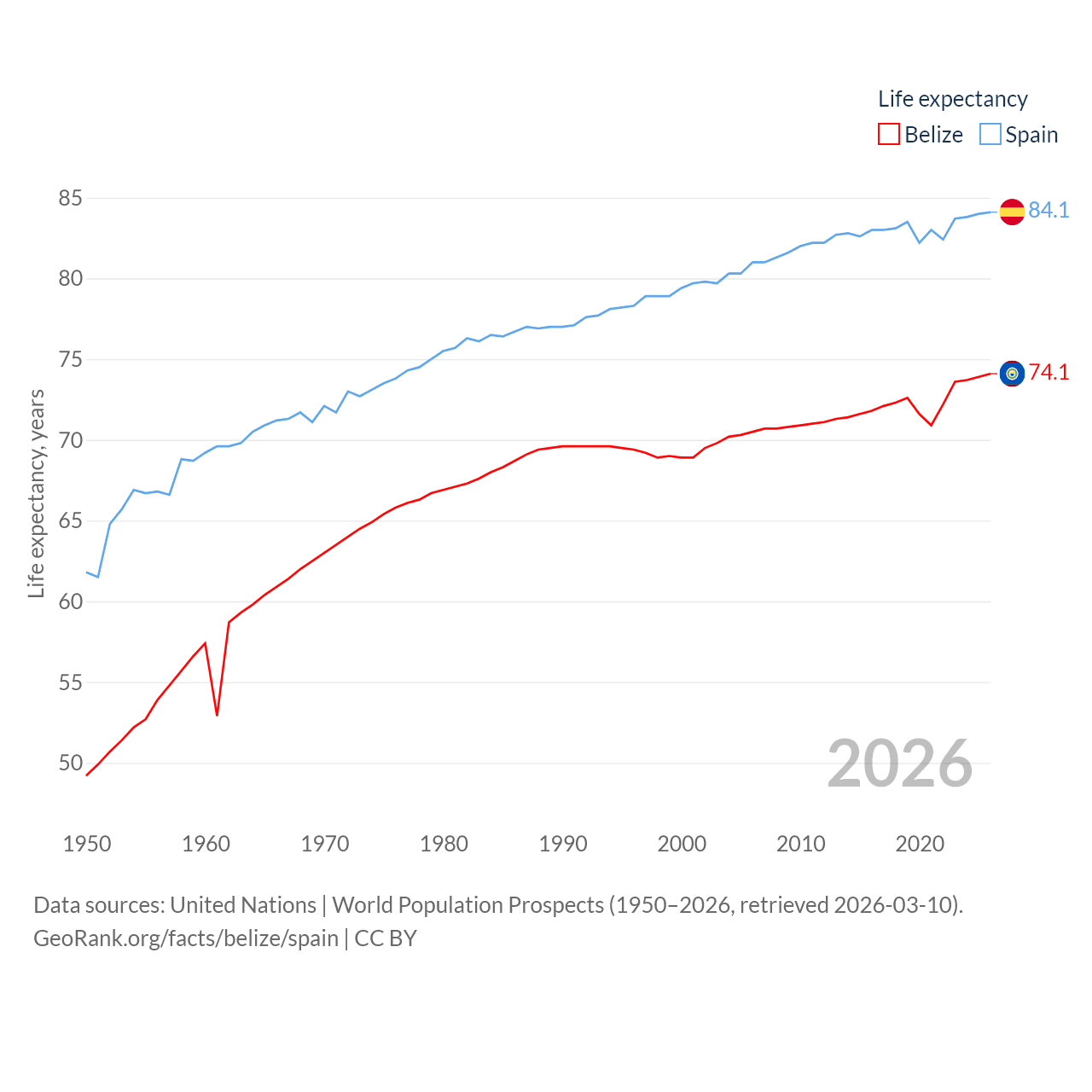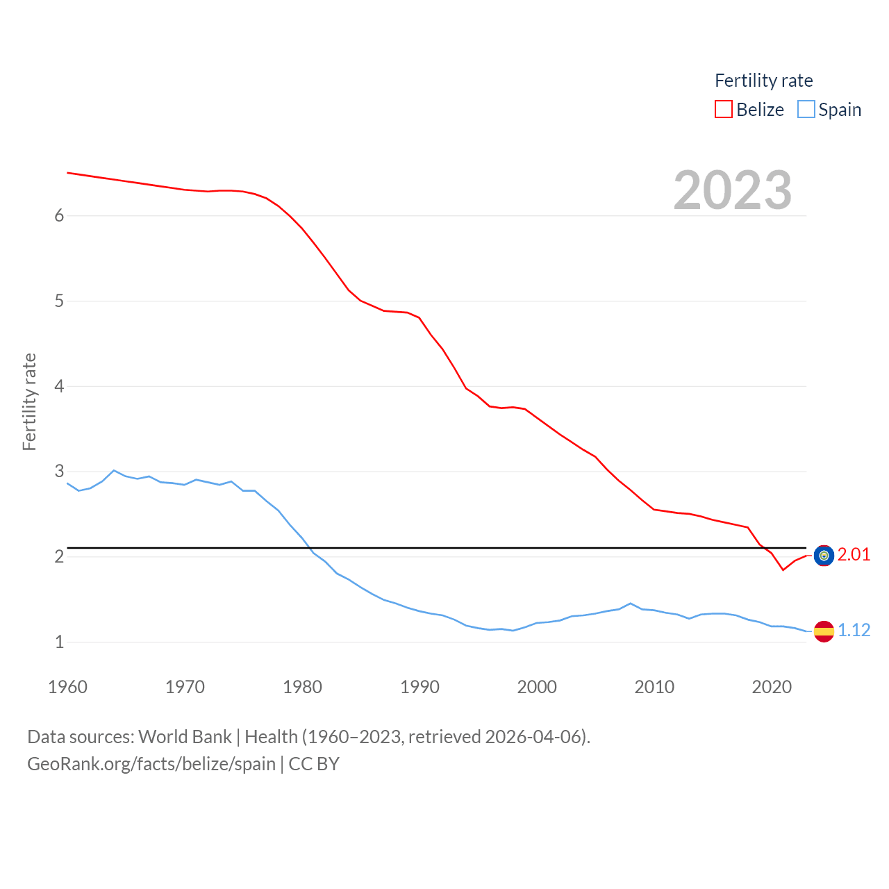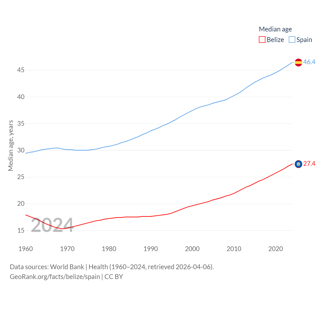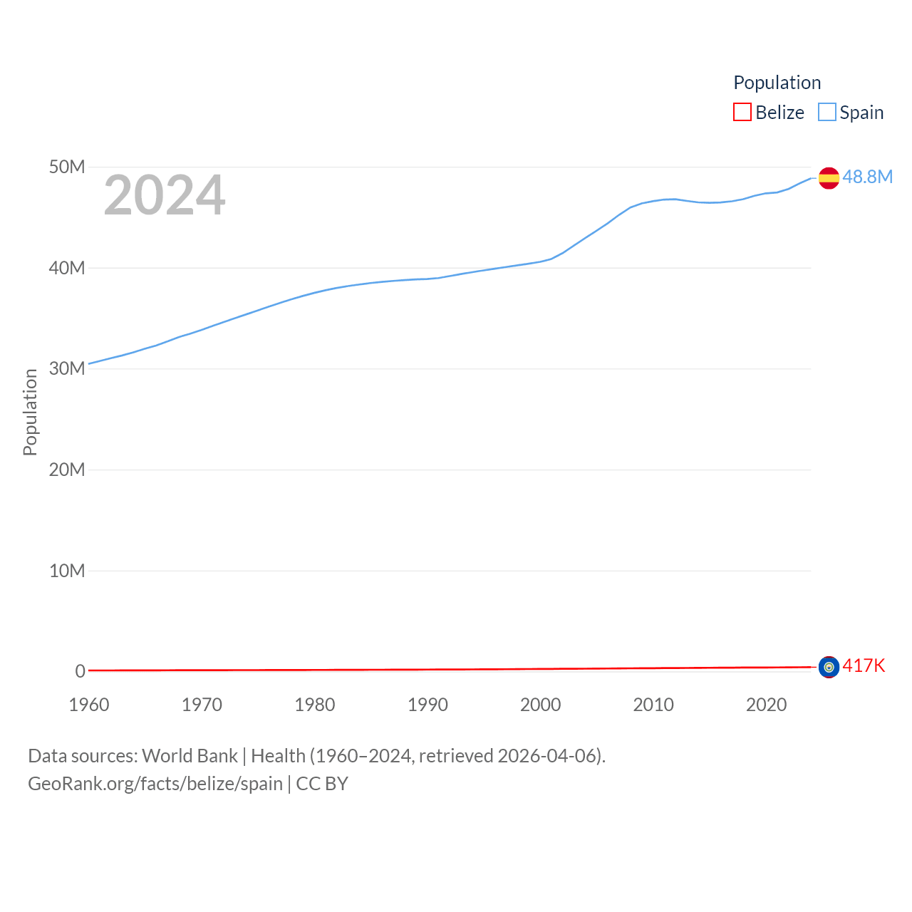 Belize has a population of 417K (ranked 171/197), compared with 48.8M in Spain (ranked 32/197). Belize's land area is 8,807 sq mi versus 192,934 sq mi for Spain (ranked 148th vs. 51st).