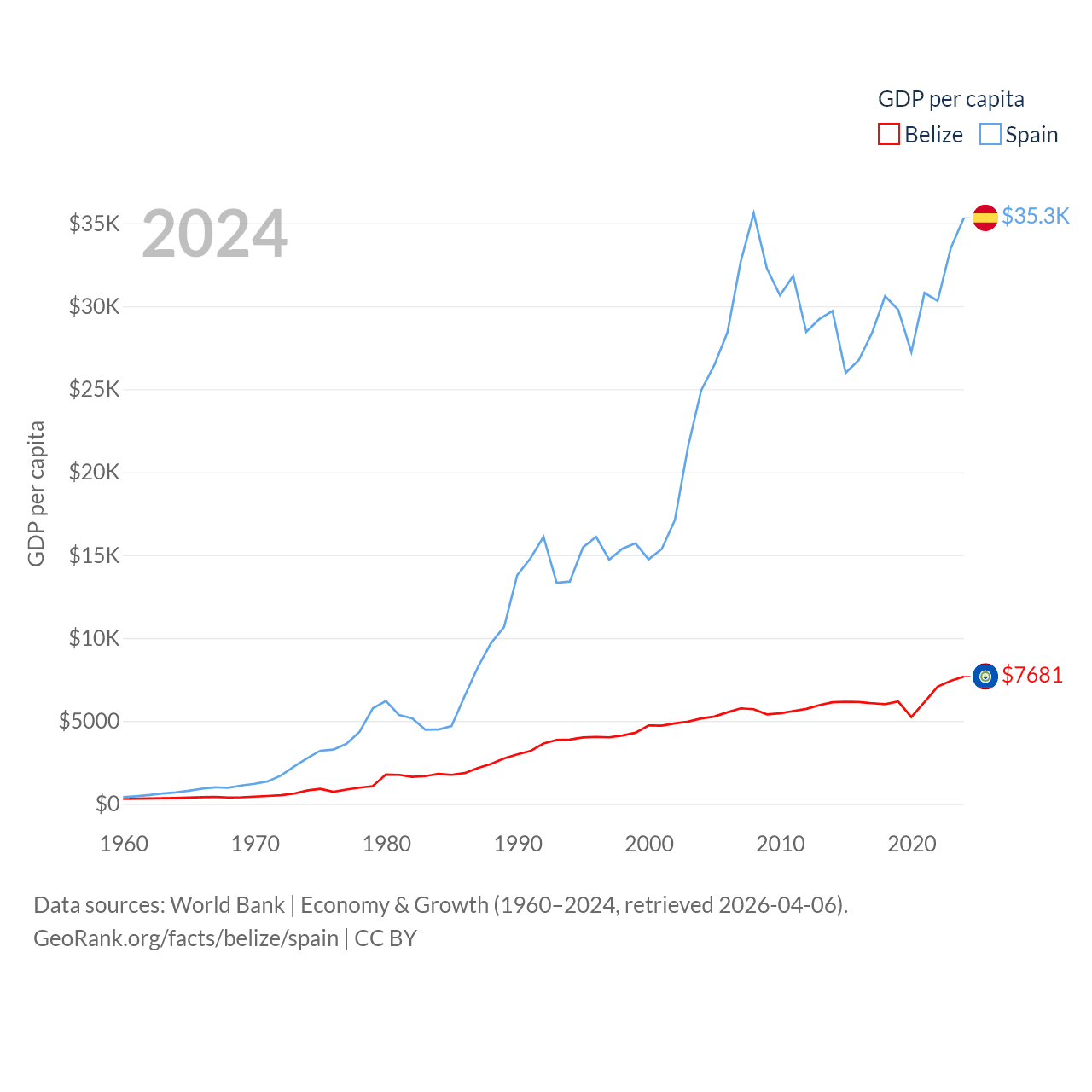 By GDP, Belize ranks 168/197 ($3.2B) and Spain ranks 15/197 ($1.73T). By GDP per capita, Belize ranks 98/197 ($7,681), while Spain ranks 32/197 ($35,327).