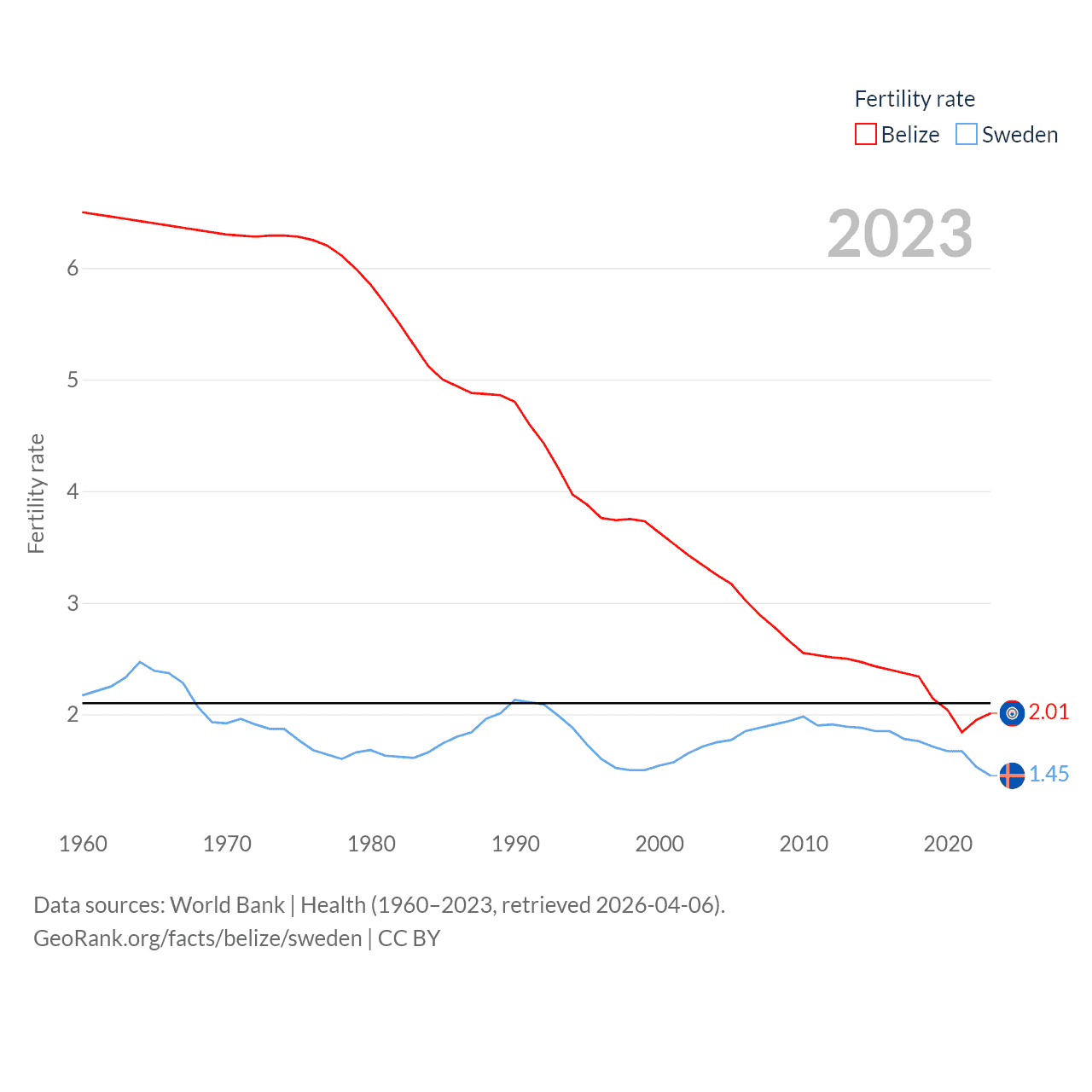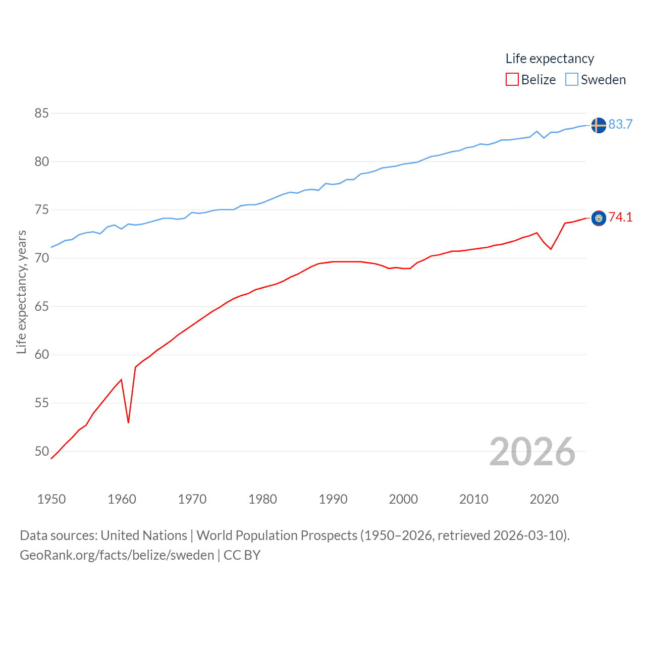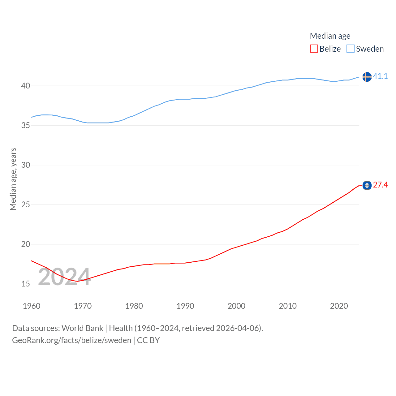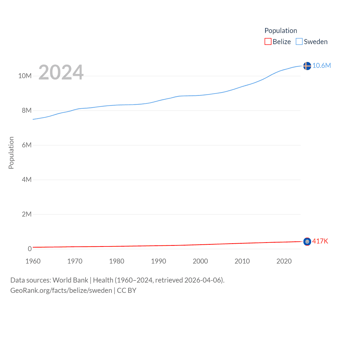 Belize has a population of 417K (ranked 171/197), compared with 10.6M in Sweden (ranked 93/197). Belize's land area is 8,807 sq mi versus 157,248 sq mi for Sweden (ranked 148th vs. 58th).