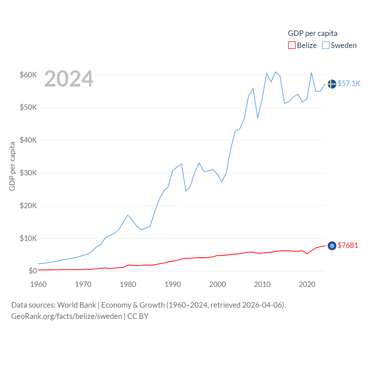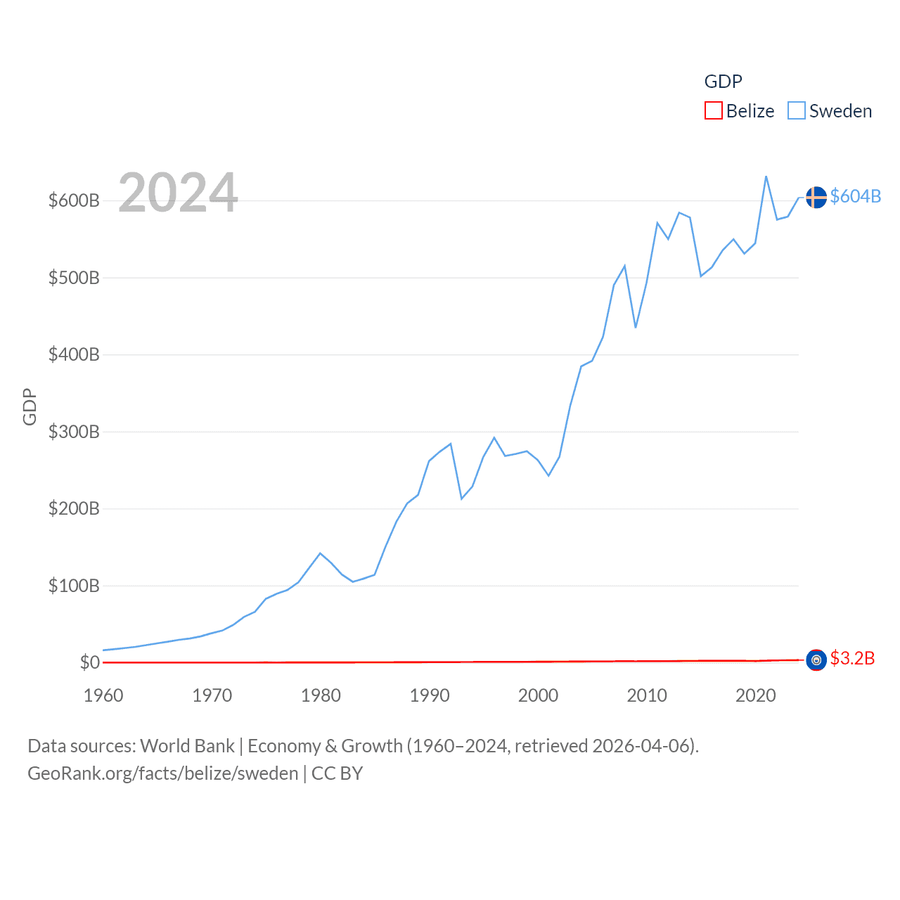 By GDP, Belize ranks 168/197 ($3.2B) and Sweden ranks 26/197 ($604B). By GDP per capita, Belize ranks 98/197 ($7,681), while Sweden ranks 17/197 ($57,117).