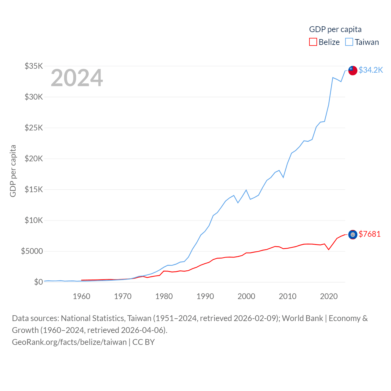 By GDP, Belize ranks 168/197 ($3.2B) and Taiwan ranks 22/197 ($802B). By GDP per capita, Belize ranks 98/197 ($7,681), while Taiwan ranks 35/197 ($34,238).