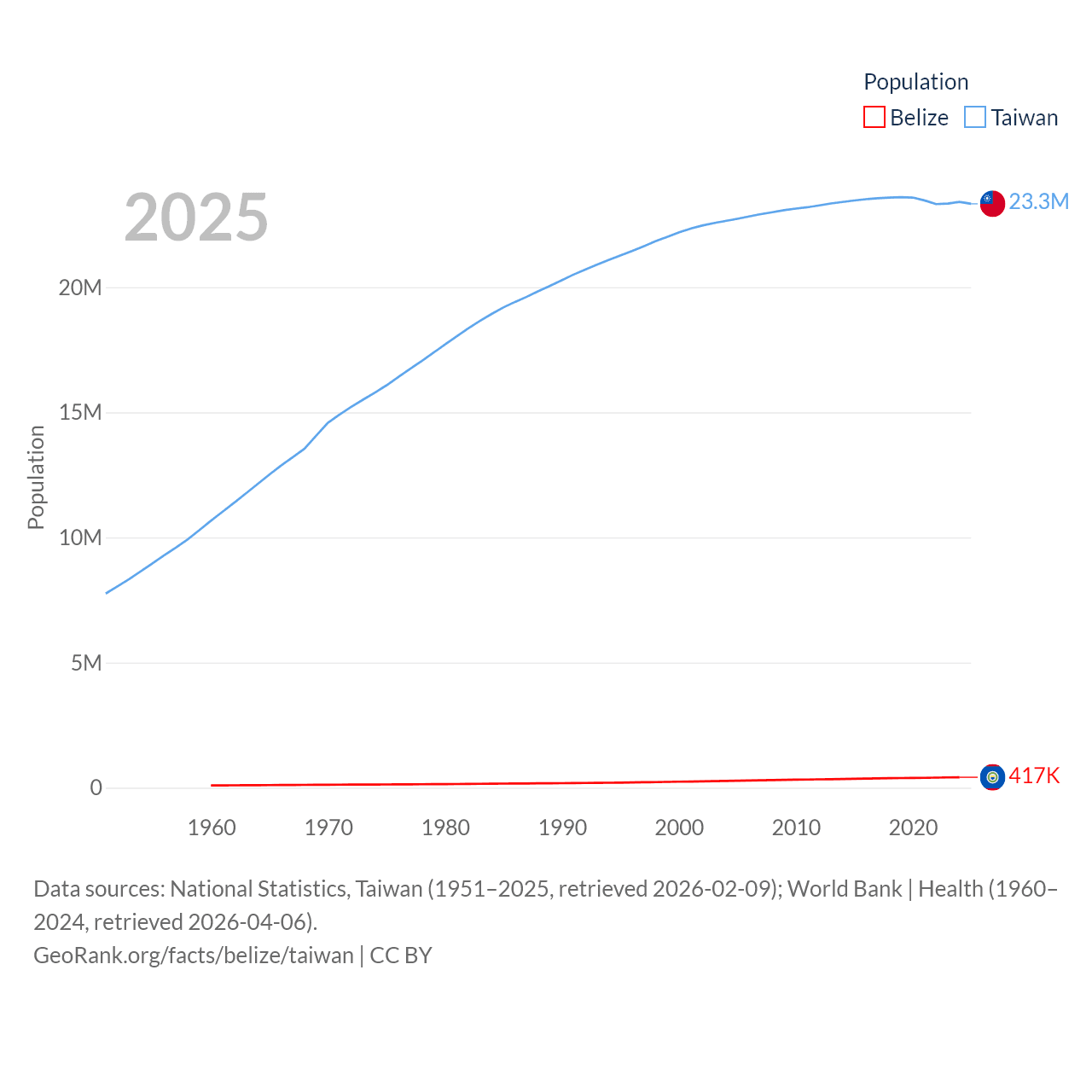 Belize has a population of 417K (ranked 171/197), compared with 23.3M in Taiwan (ranked 60/197). Belize's land area is 8,807 sq mi versus 13,976 sq mi for Taiwan (ranked 148th vs. 133rd).