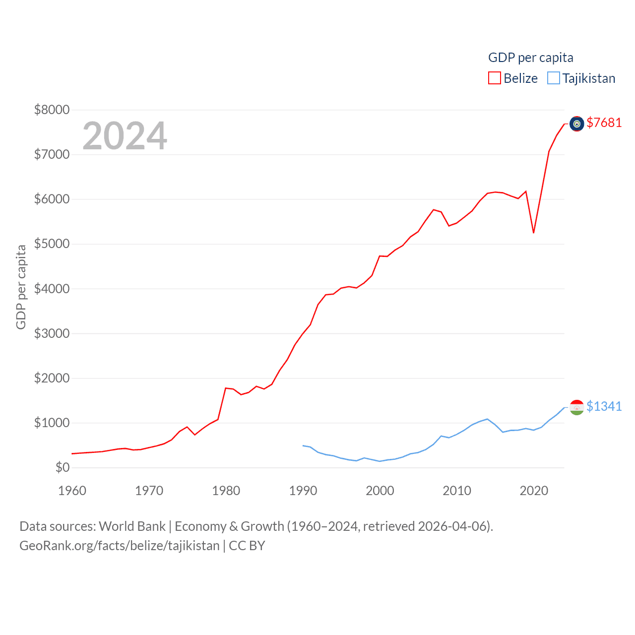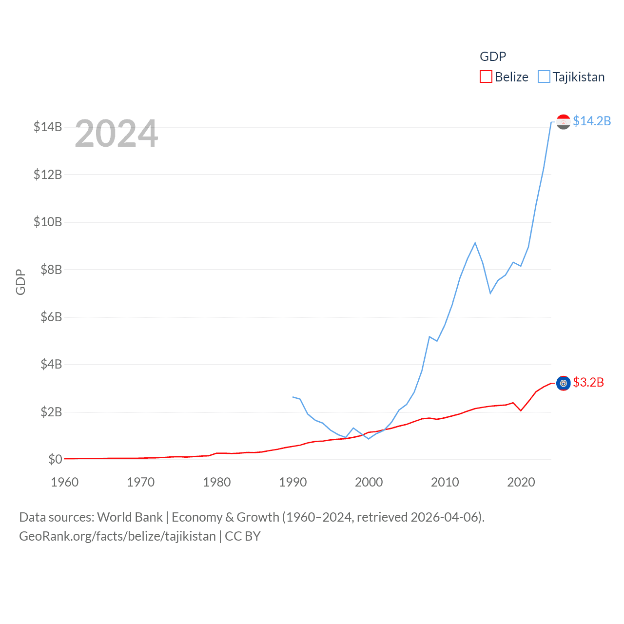 By GDP, Belize ranks 168/197 ($3.2B) and Tajikistan ranks 145/197 ($14.2B). By GDP per capita, Belize ranks 98/197 ($7,681), while Tajikistan ranks 166/197 ($1,341).