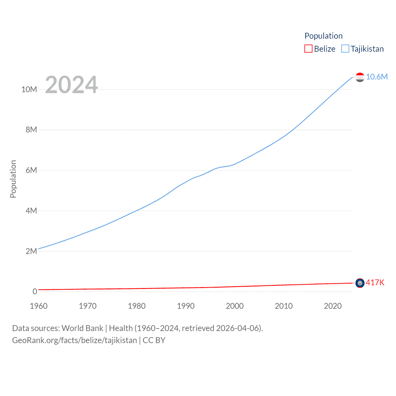 Belize has a population of 417K (ranked 171/197), compared with 10.6M in Tajikistan (ranked 91/197). Belize's land area is 8,807 sq mi versus 53,587 sq mi for Tajikistan (ranked 148th vs. 93rd).
