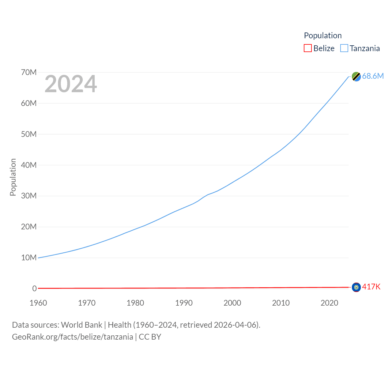 Belize has a population of 417K (ranked 171/197), compared with 68.6M in Tanzania (ranked 22/197). Belize's land area is 8,807 sq mi versus 342,009 sq mi for Tanzania (ranked 148th vs. 31st).