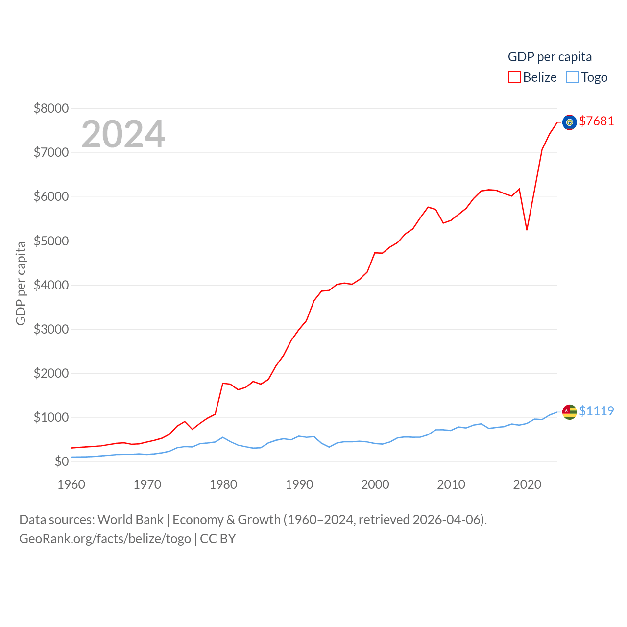 By GDP, Belize ranks 168/197 ($3.2B) and Togo ranks 154/197 ($10.7B). By GDP per capita, Belize ranks 98/197 ($7,681), while Togo ranks 172/197 ($1,119).