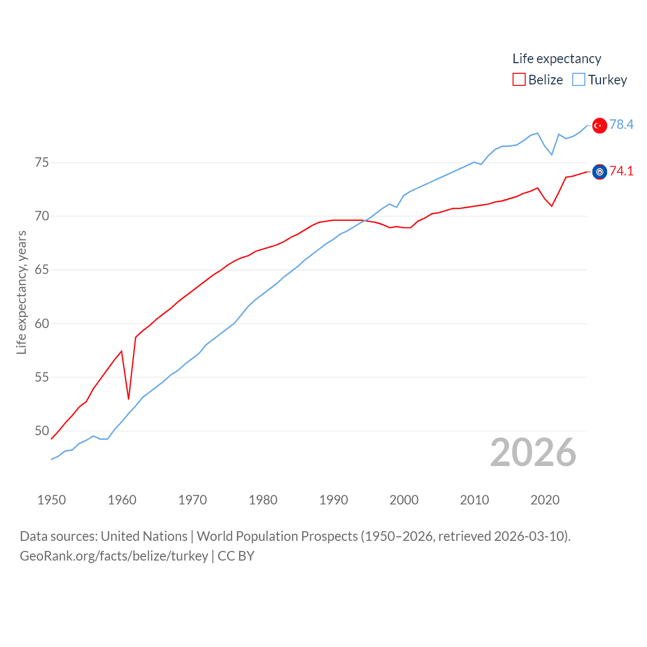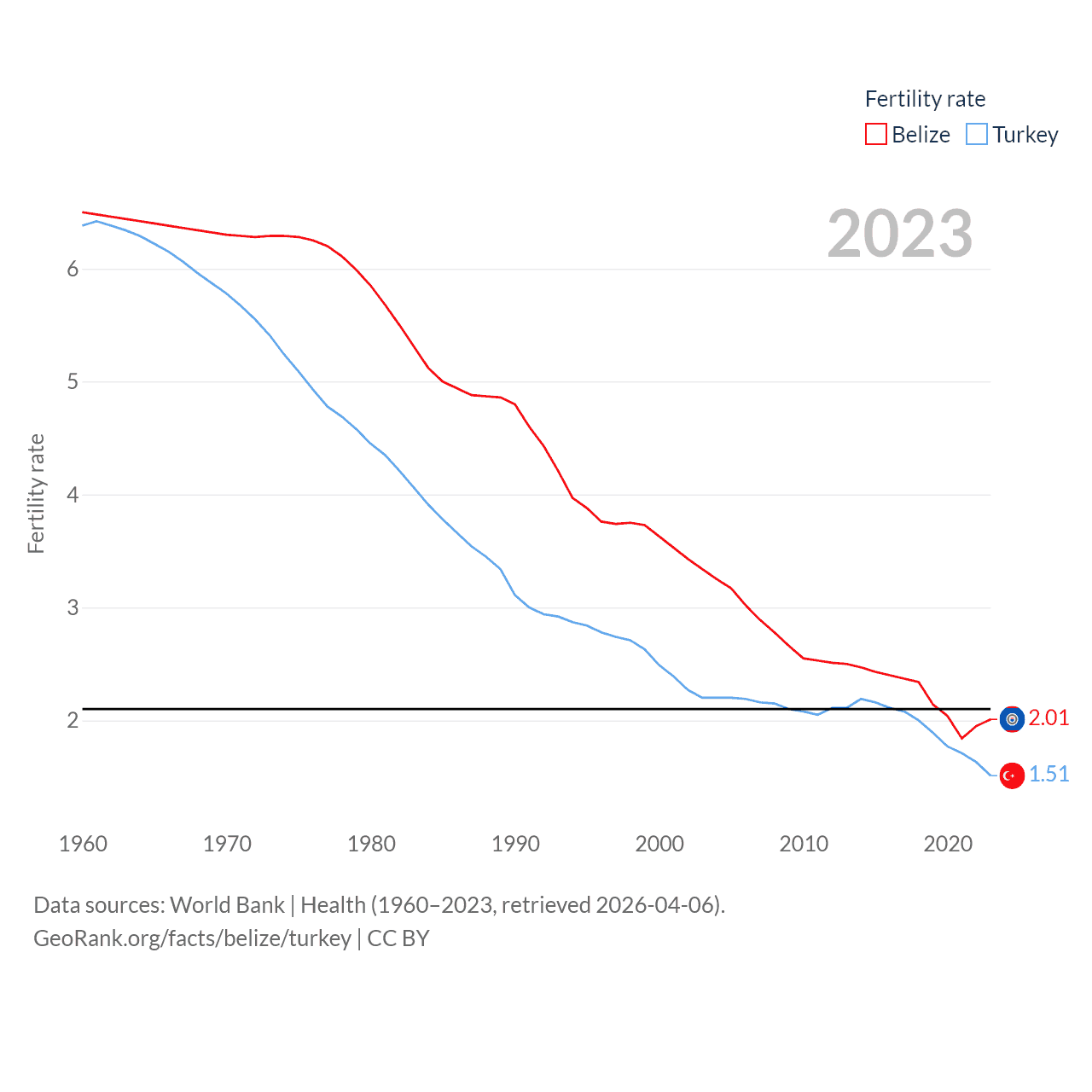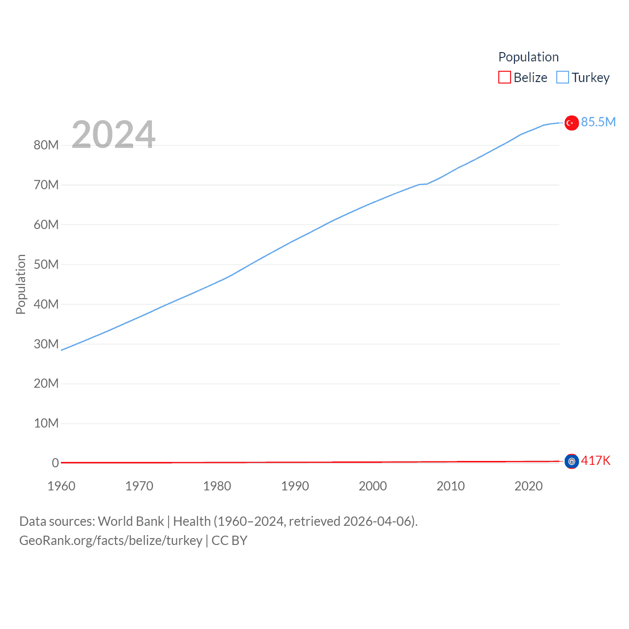 Belize has a population of 417K (ranked 171/197), compared with 85.5M in Turkey (ranked 18/197). Belize's land area is 8,807 sq mi versus 297,156 sq mi for Turkey (ranked 148th vs. 36th).