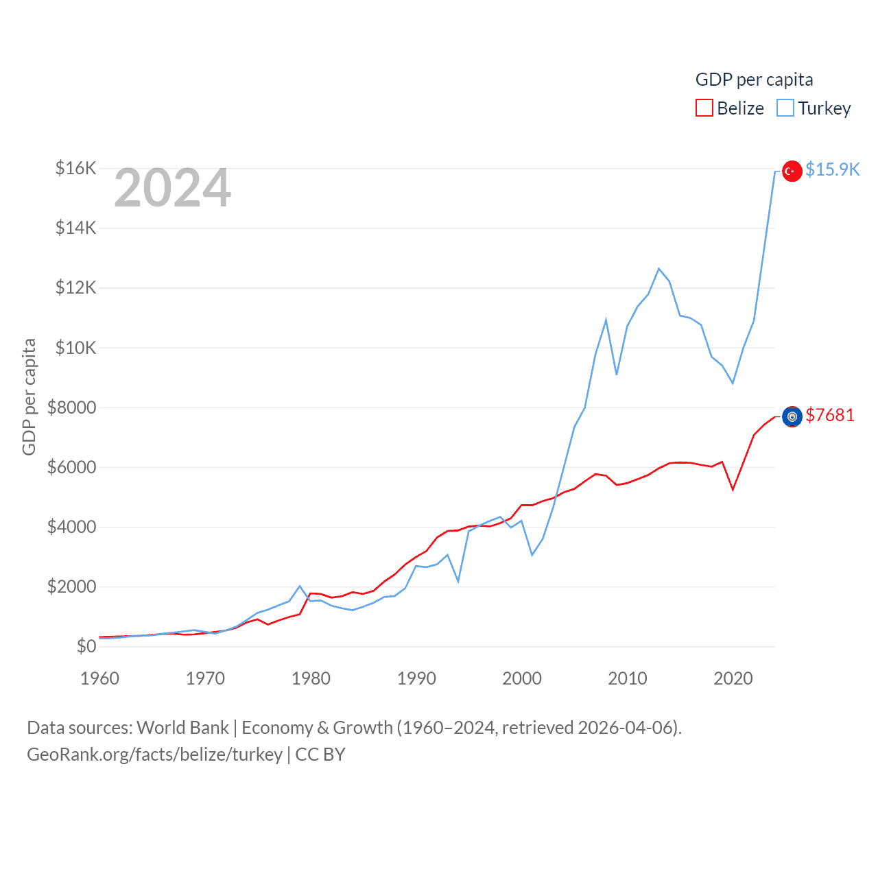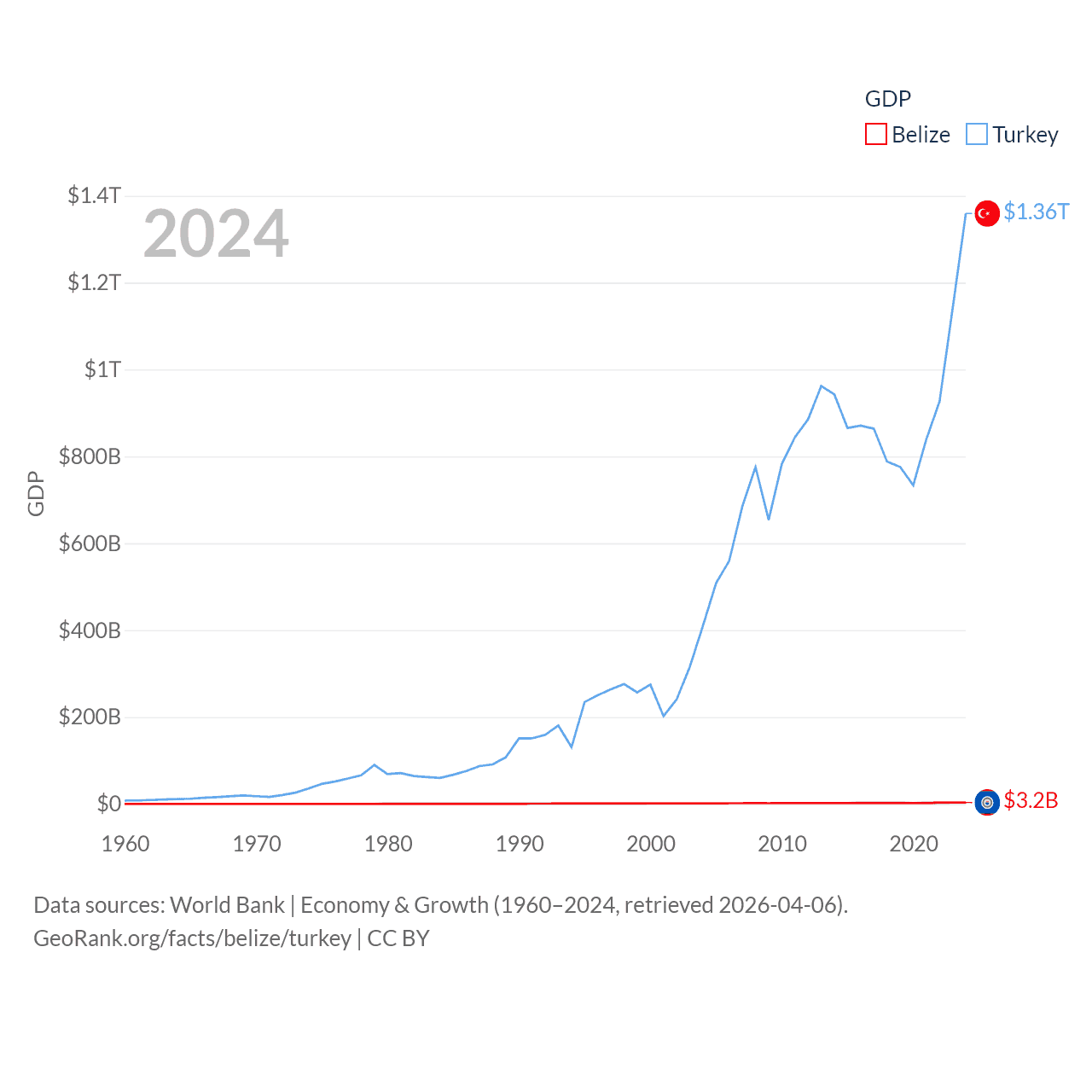 By GDP, Belize ranks 168/197 ($3.2B) and Turkey ranks 17/197 ($1.36T). By GDP per capita, Belize ranks 98/197 ($7,681), while Turkey ranks 66/197 ($15,893).