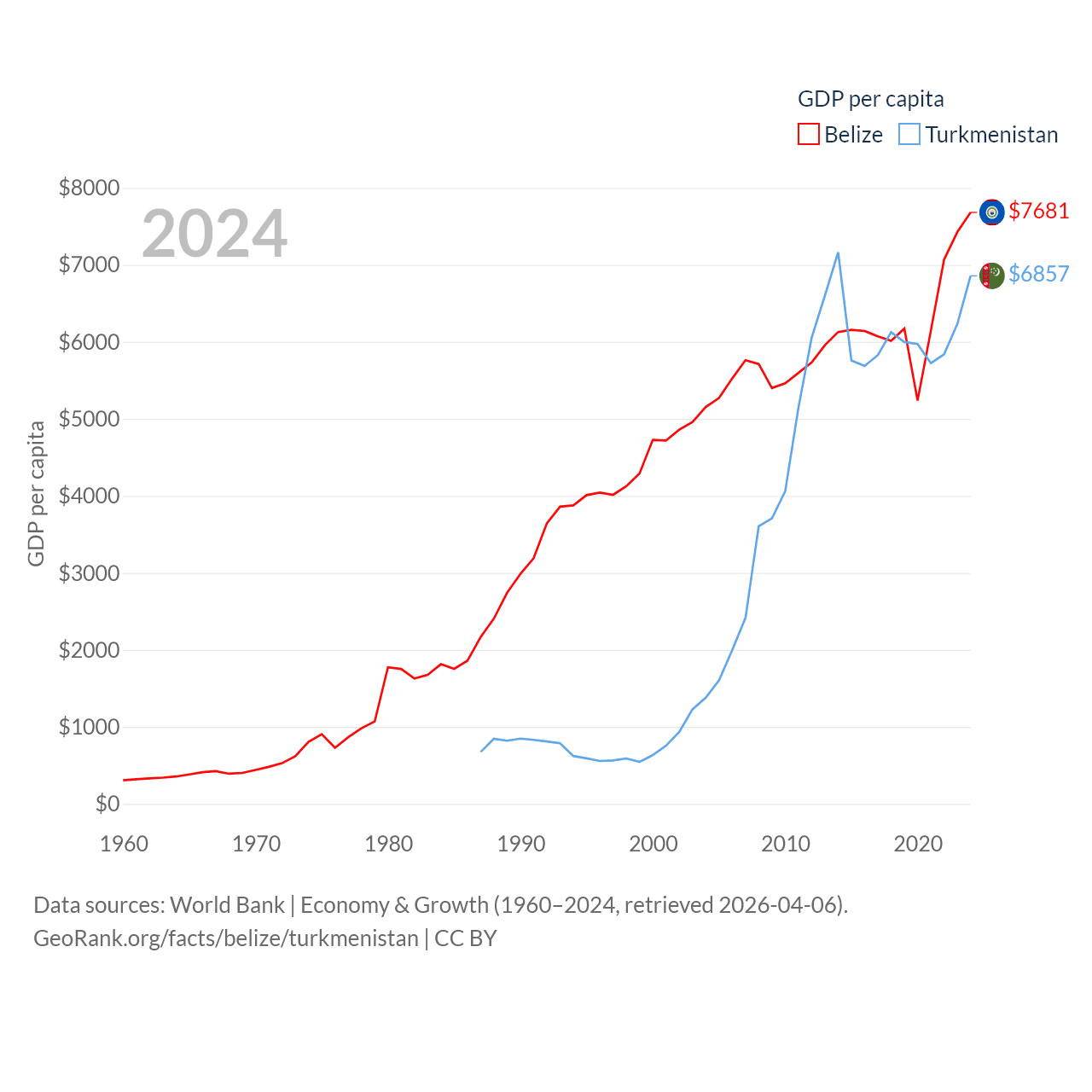 By GDP, Belize ranks 168/197 ($3.2B) and Turkmenistan ranks 92/197 ($51.4B). By GDP per capita, Belize ranks 98/197 ($7,681), while Turkmenistan ranks 104/197 ($6,857).