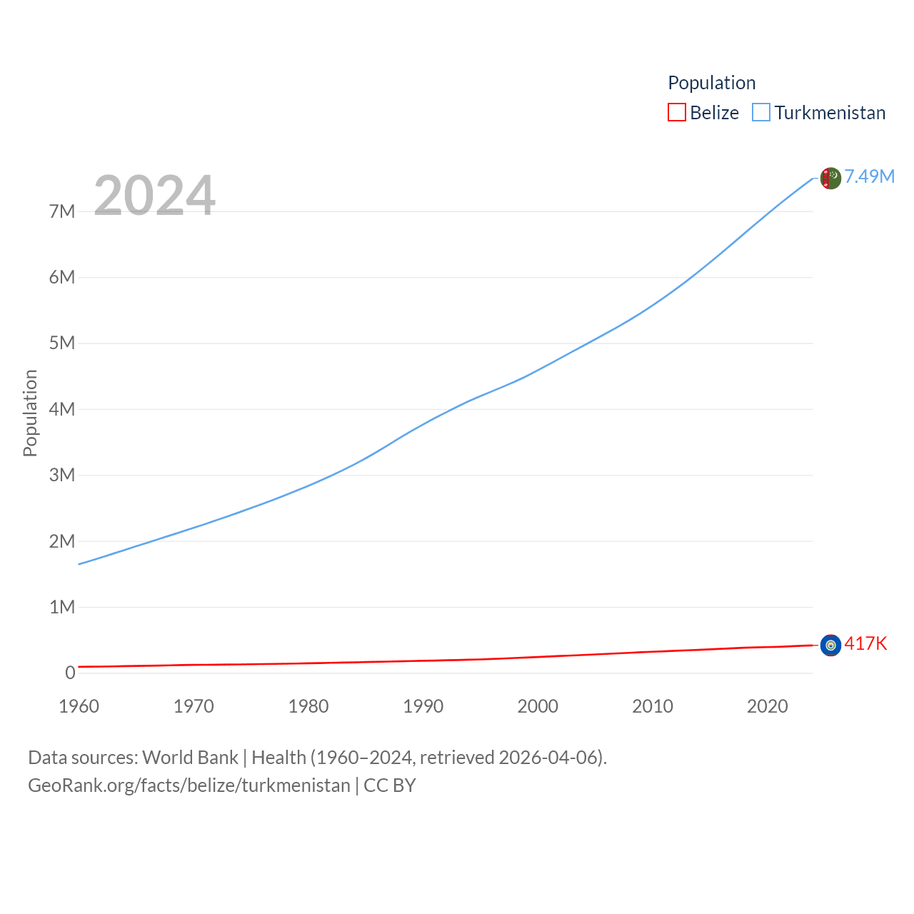Belize has a population of 417K (ranked 171/197), compared with 7.49M in Turkmenistan (ranked 104/197). Belize's land area is 8,807 sq mi versus 181,441 sq mi for Turkmenistan (ranked 148th vs. 53rd).