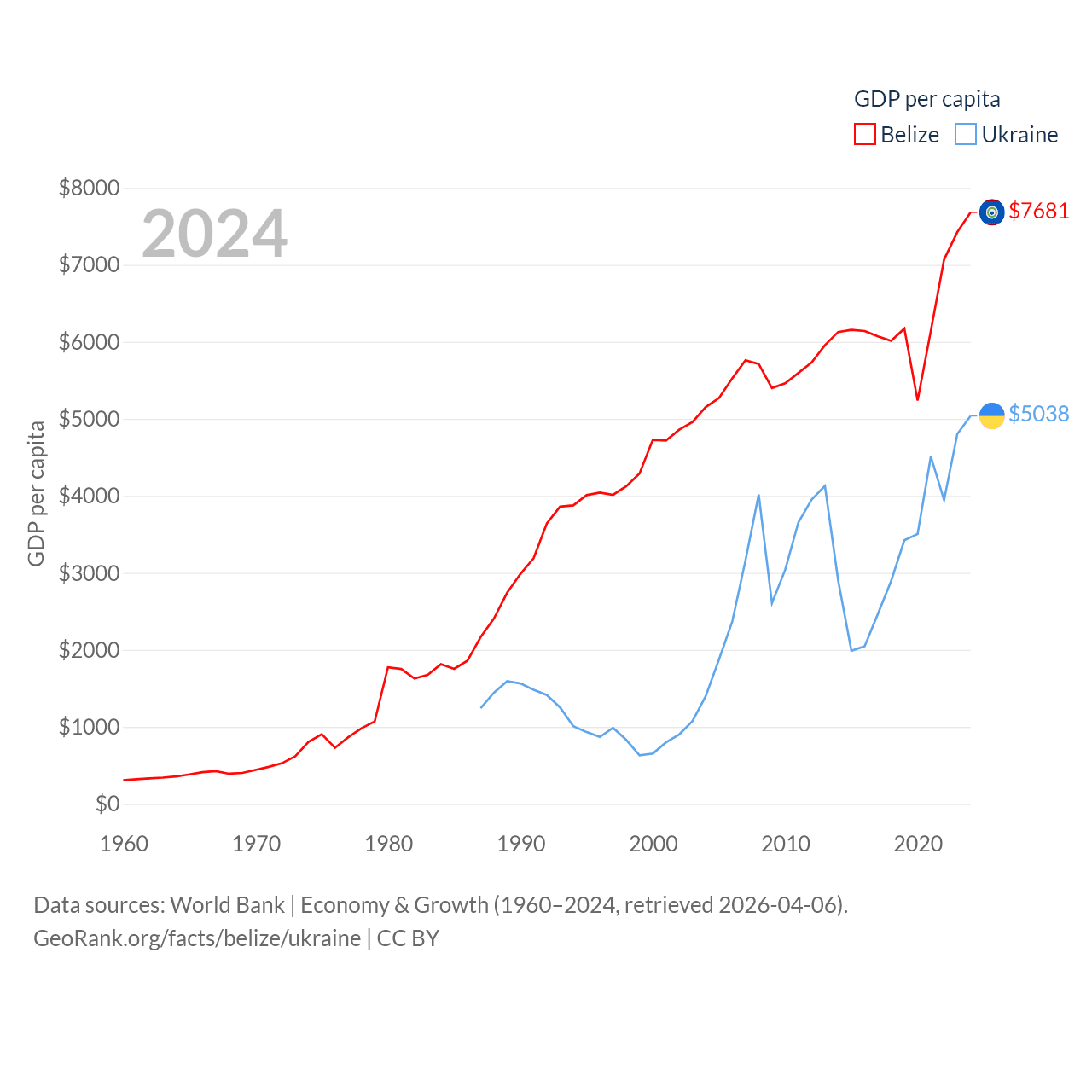 By GDP, Belize ranks 168/197 ($3.2B) and Ukraine ranks 57/197 ($191B). By GDP per capita, Belize ranks 98/197 ($7,681), while Ukraine ranks 120/197 ($5,038).