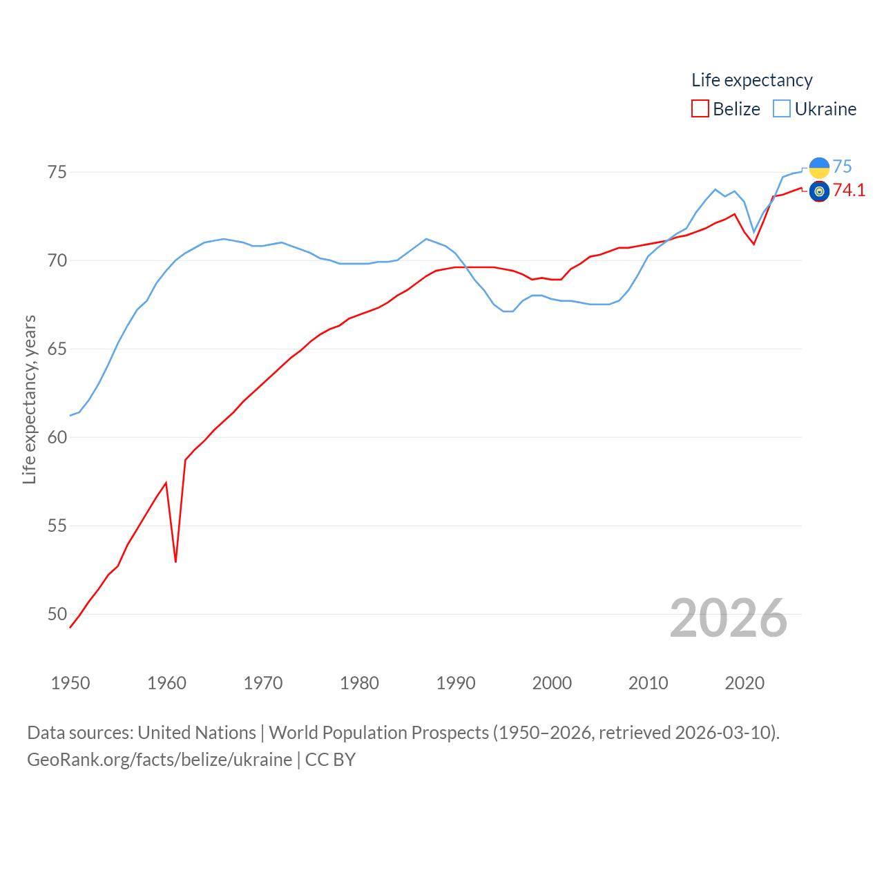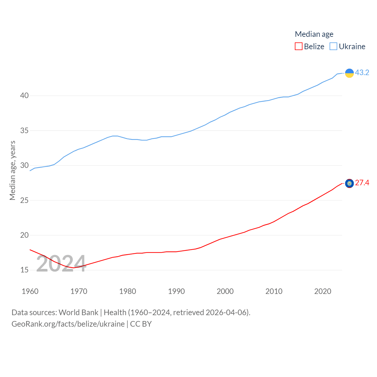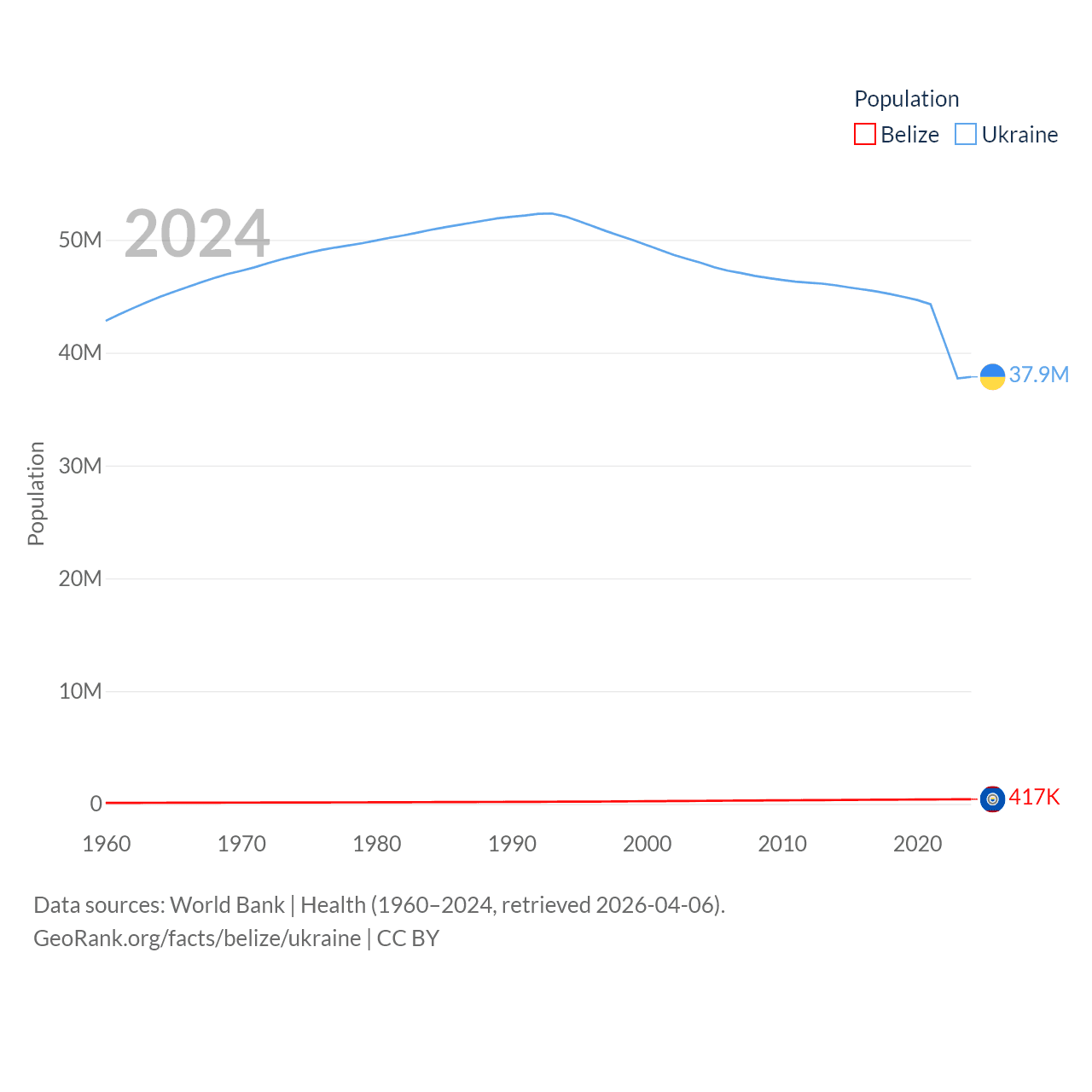 Belize has a population of 417K (ranked 171/197), compared with 37.9M in Ukraine (ranked 41/197). Belize's land area is 8,807 sq mi versus 223,708 sq mi for Ukraine (ranked 148th vs. 46th).