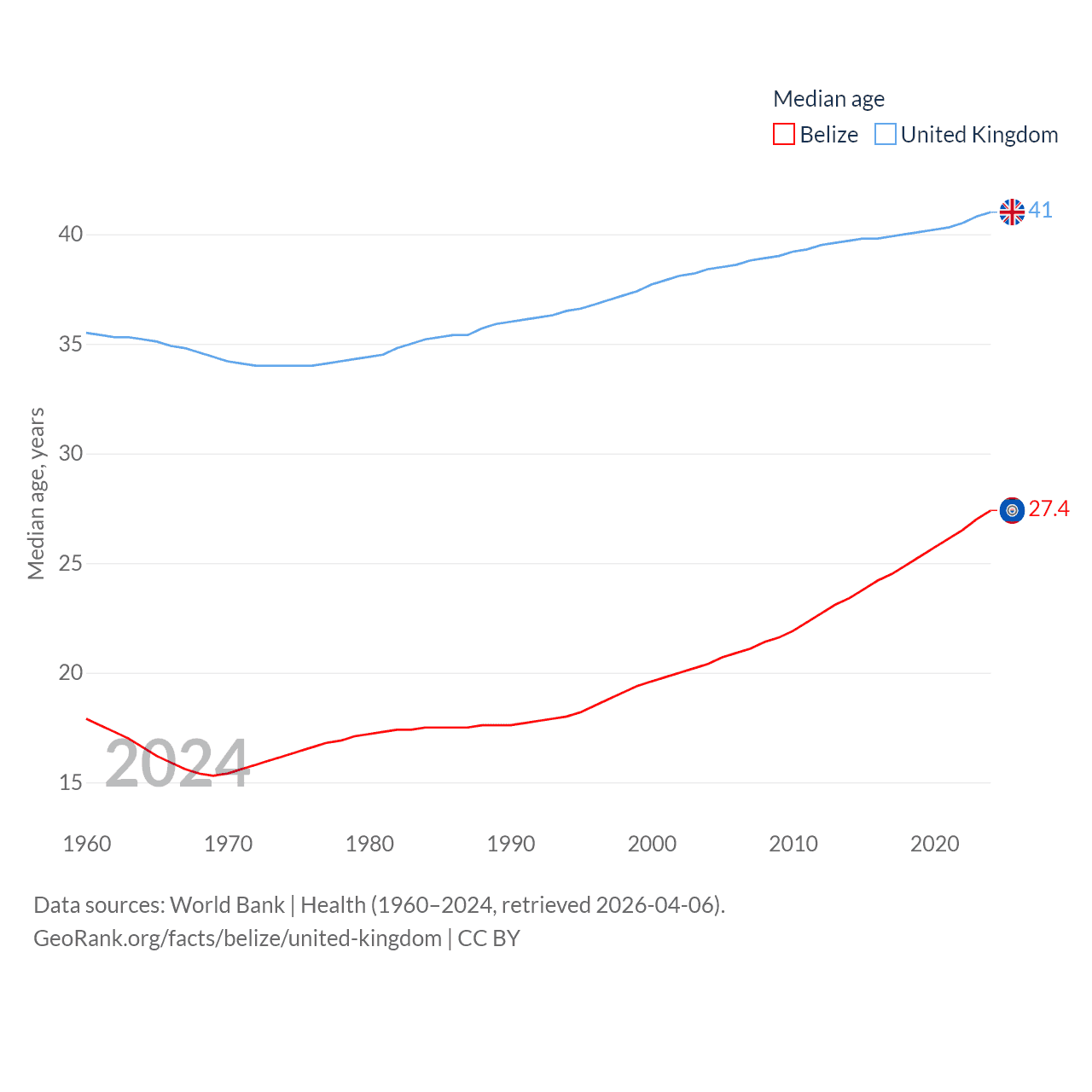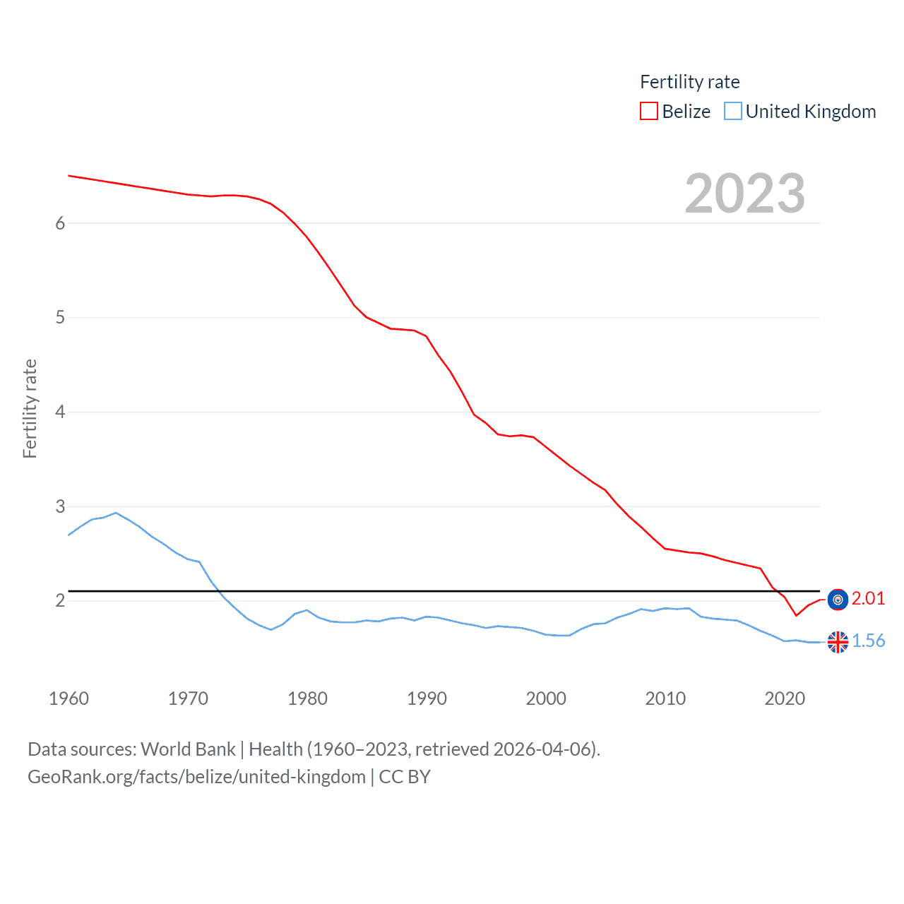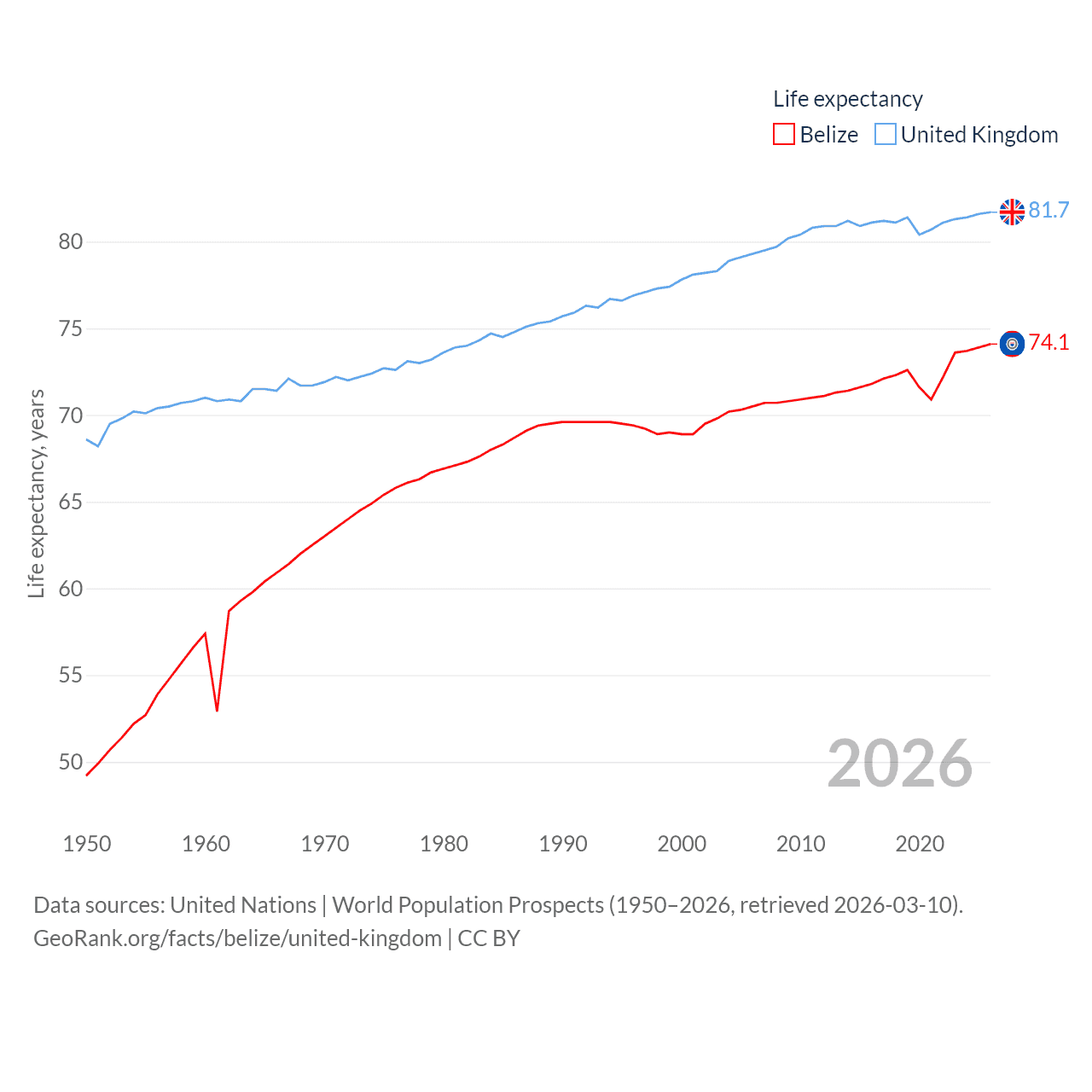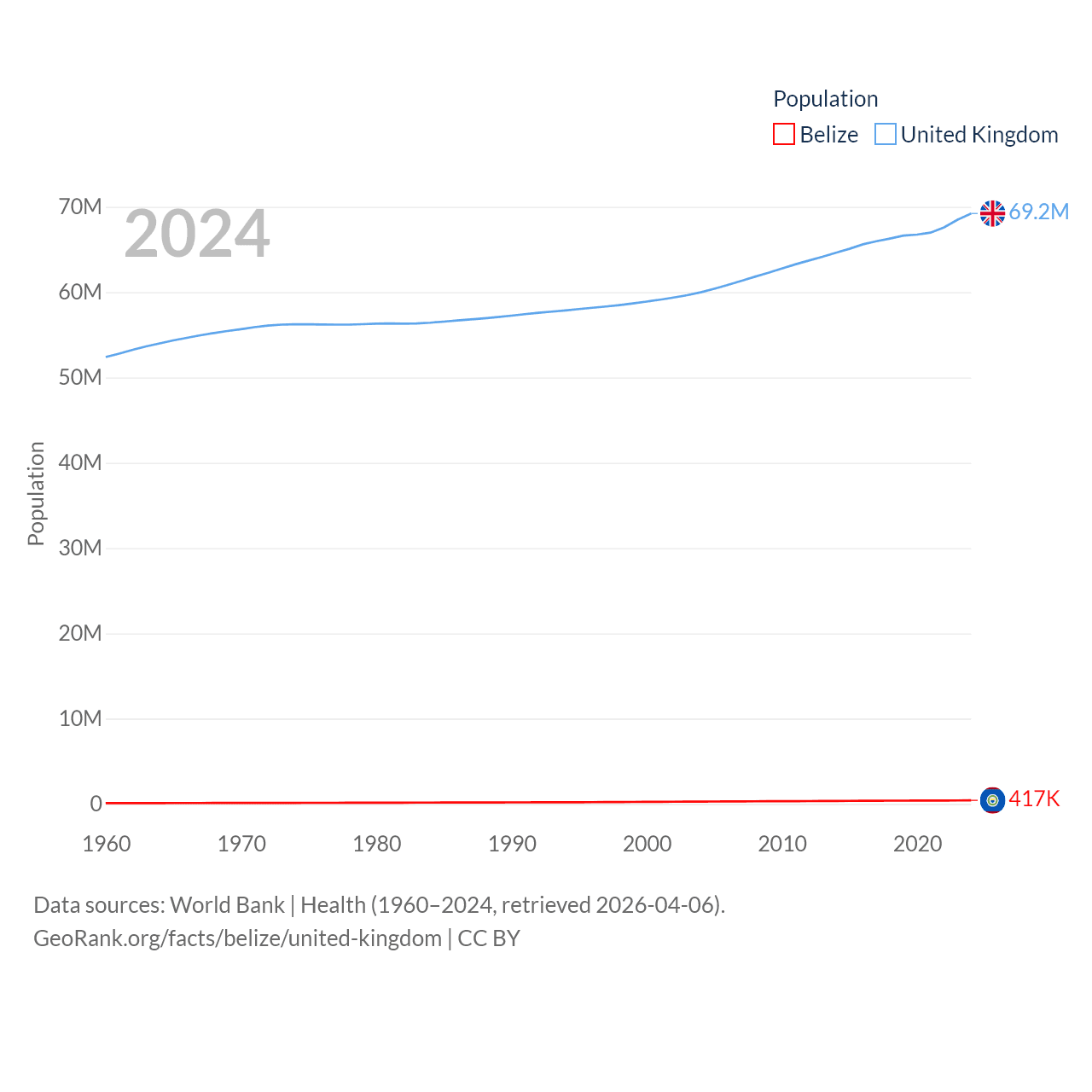 Belize has a population of 417K (ranked 171/197), compared with 69.2M in The United Kingdom (ranked 21/197). Belize's land area is 8,807 sq mi versus 93,410 sq mi for The United Kingdom (ranked 148th vs. 78th).