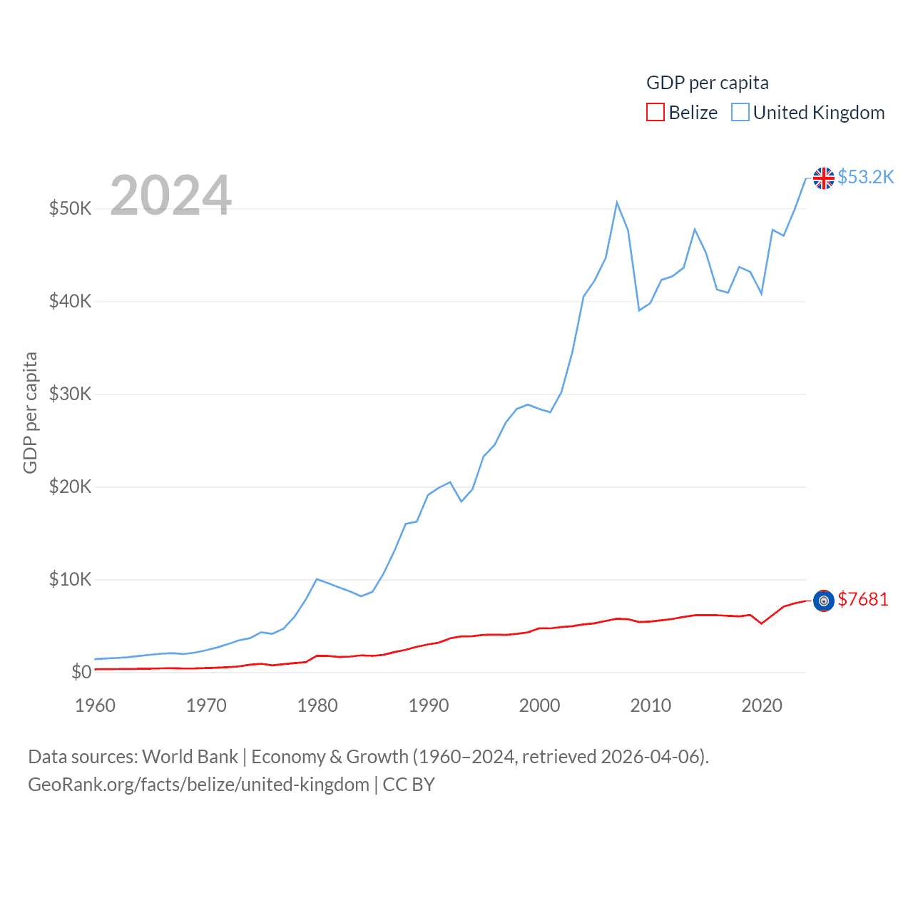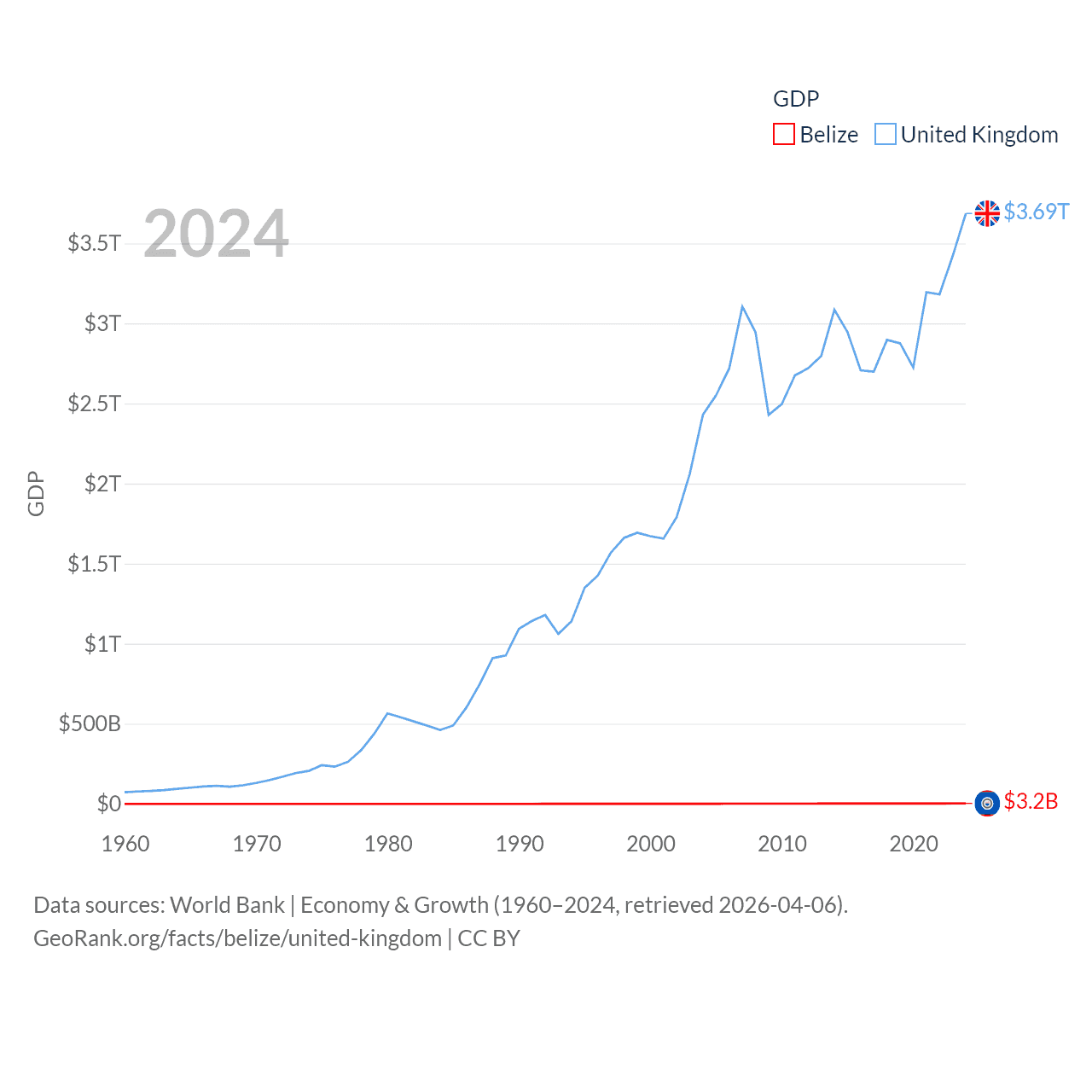By GDP, Belize ranks 168/197 ($3.2B) and The United Kingdom ranks 6/197 ($3.69T). By GDP per capita, Belize ranks 98/197 ($7,681), while The United Kingdom ranks 22/197 ($53,246).