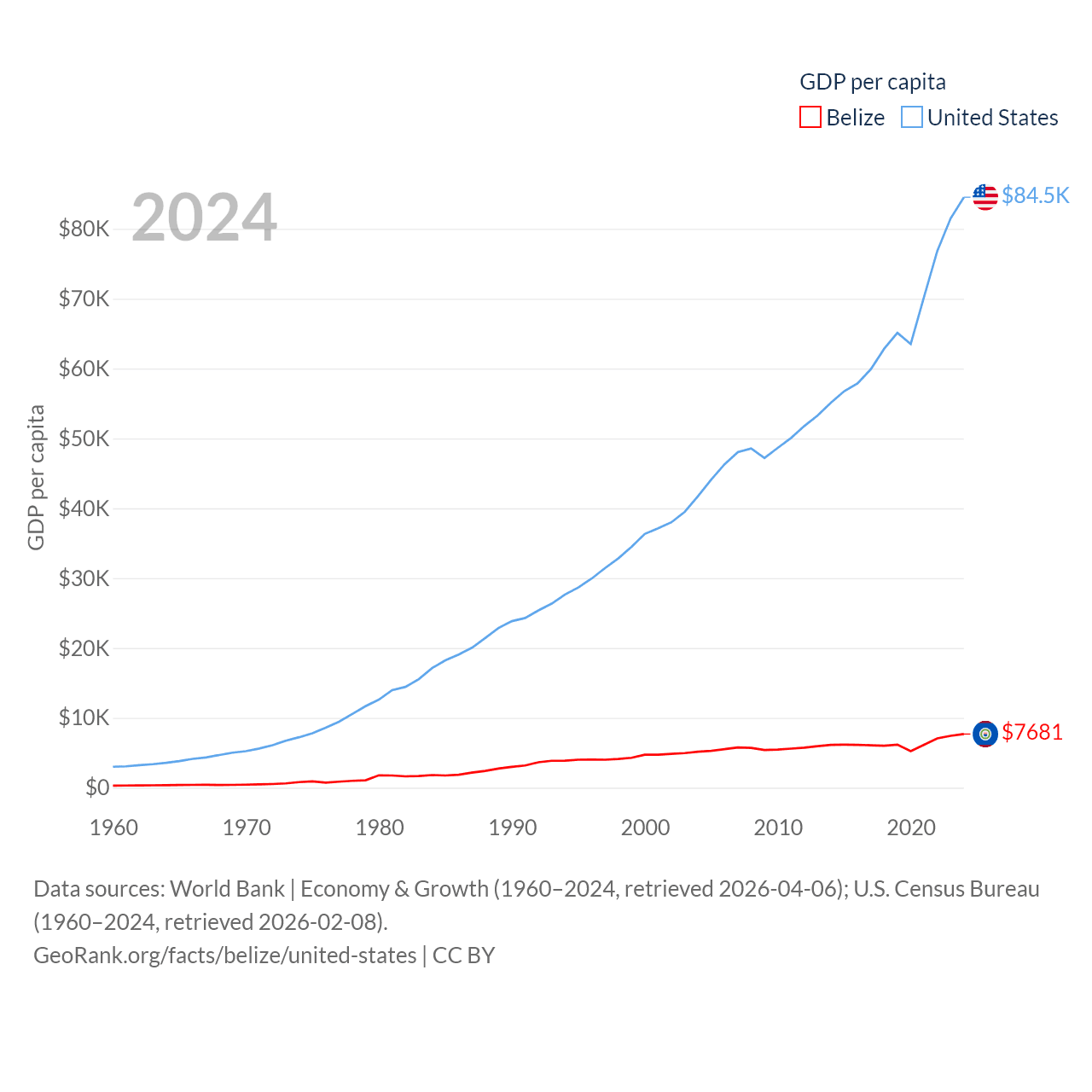 By GDP, Belize ranks 168/197 ($3.2B) and The United States ranks 1/197 ($28.8T). By GDP per capita, Belize ranks 98/197 ($7,681), while The United States ranks 10/197 ($84,534).