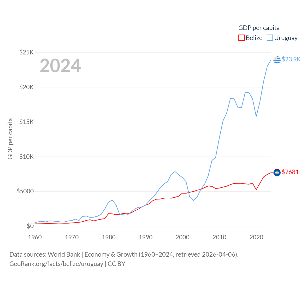 By GDP, Belize ranks 168/197 ($3.2B) and Uruguay ranks 81/197 ($81B). By GDP per capita, Belize ranks 98/197 ($7,681), while Uruguay ranks 52/197 ($23,907).