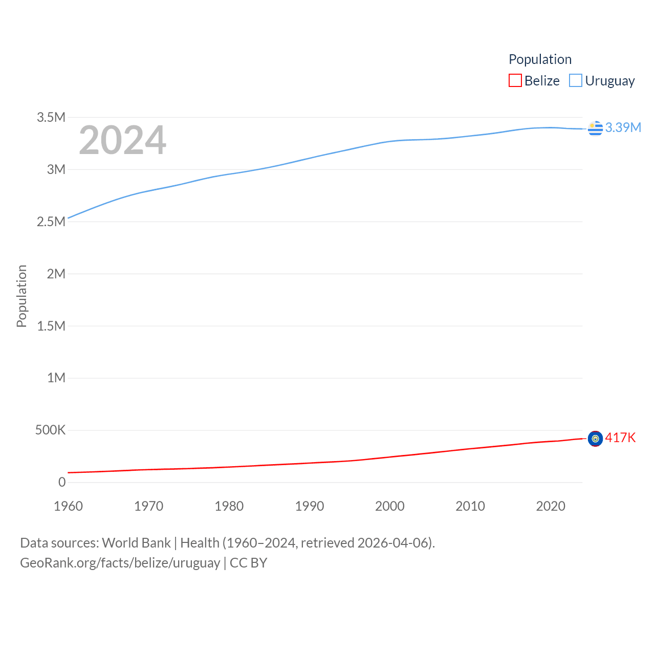 Belize has a population of 417K (ranked 171/197), compared with 3.39M in Uruguay (ranked 133/197). Belize's land area is 8,807 sq mi versus 67,576 sq mi for Uruguay (ranked 148th vs. 89th).