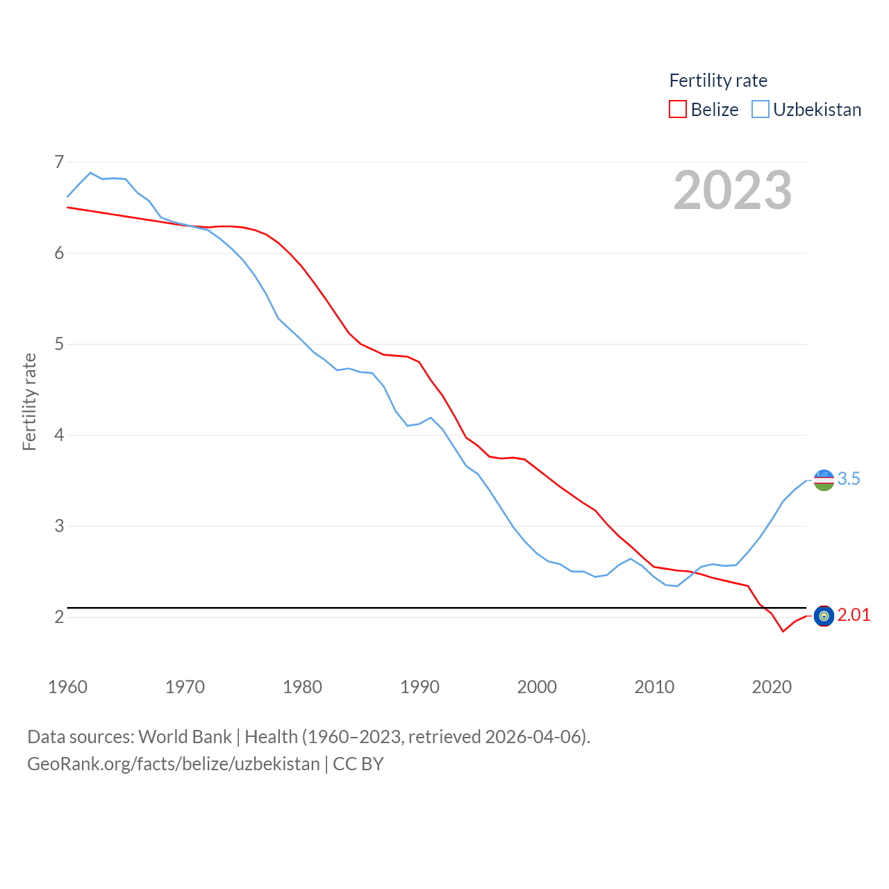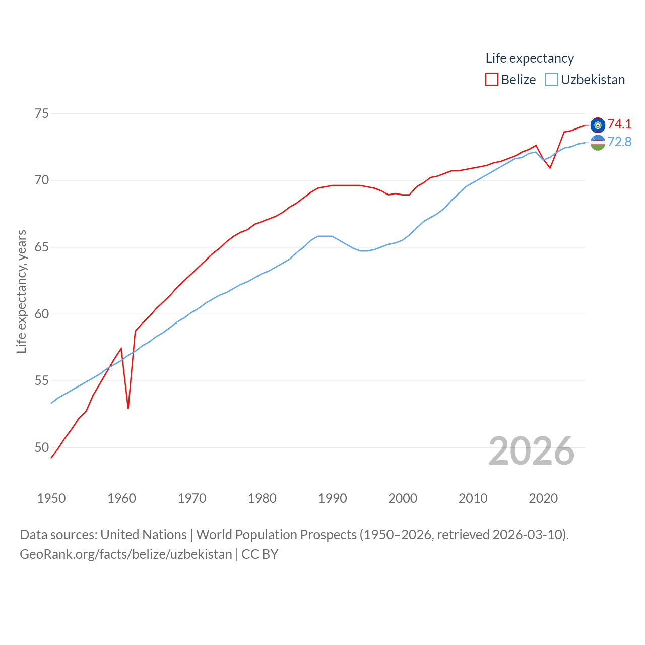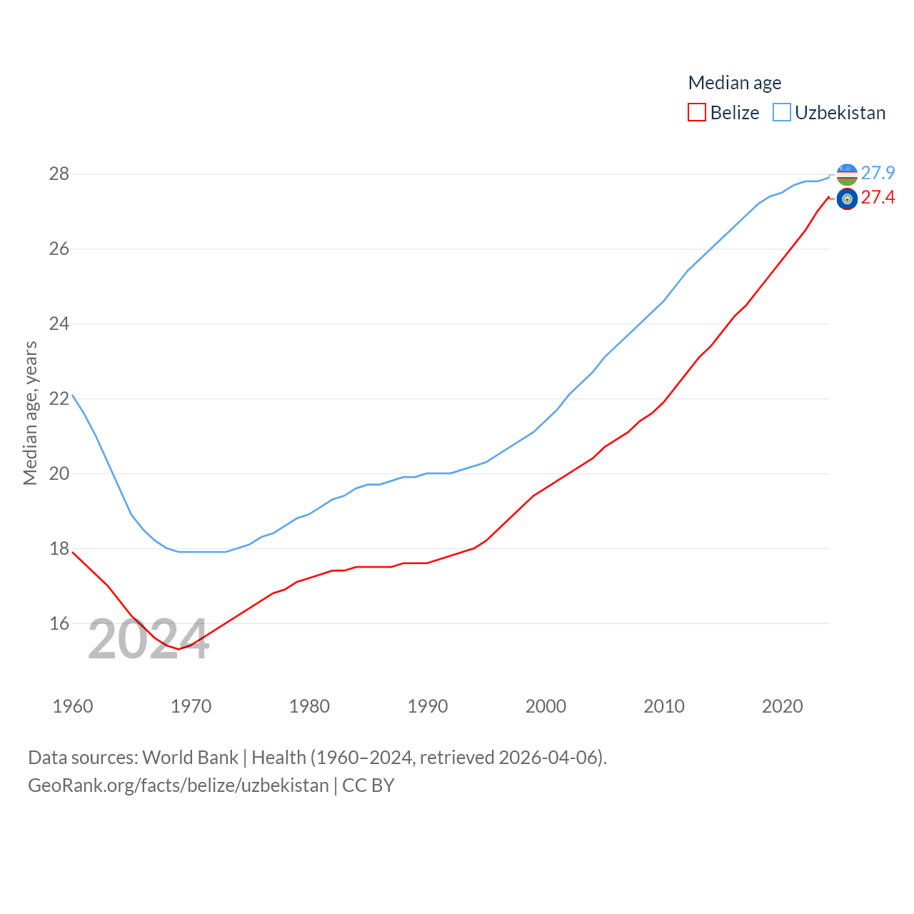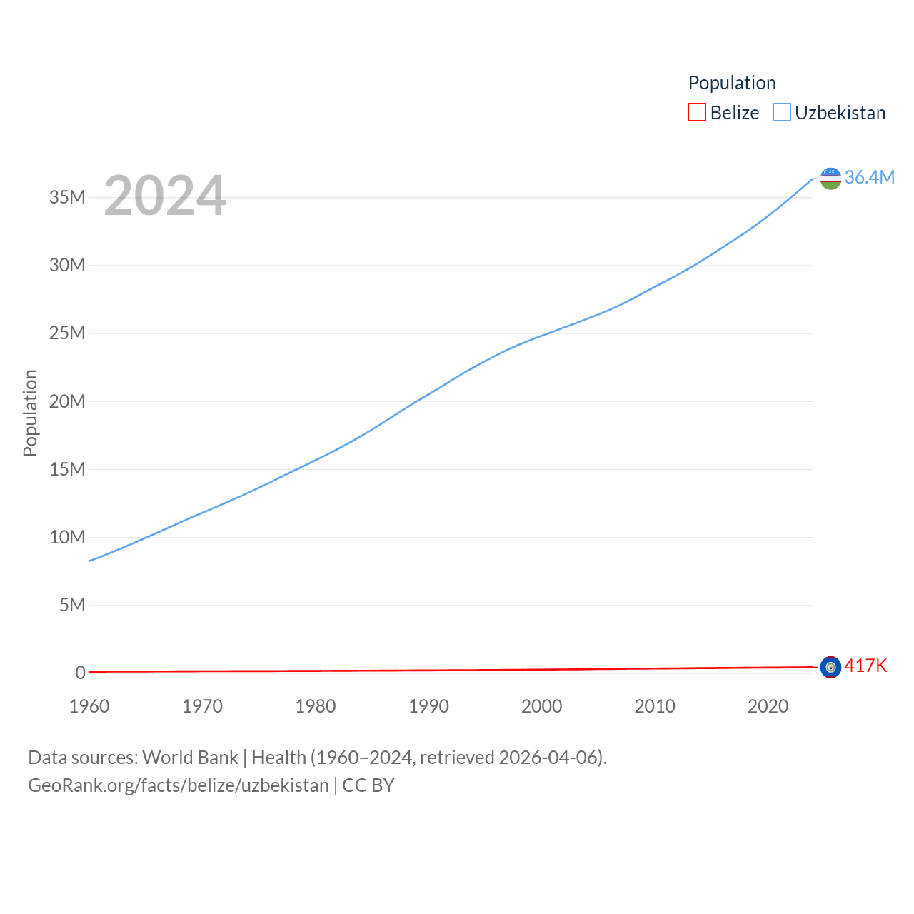 Belize has a population of 417K (ranked 171/197), compared with 36.4M in Uzbekistan (ranked 43/197). Belize's land area is 8,807 sq mi versus 170,136 sq mi for Uzbekistan (ranked 148th vs. 56th).