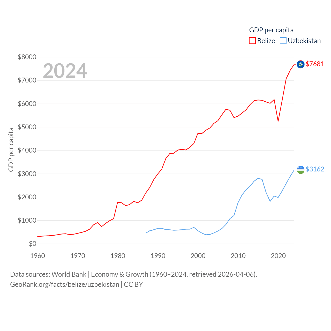 By GDP, Belize ranks 168/197 ($3.2B) and Uzbekistan ranks 66/197 ($115B). By GDP per capita, Belize ranks 98/197 ($7,681), while Uzbekistan ranks 139/197 ($3,162).