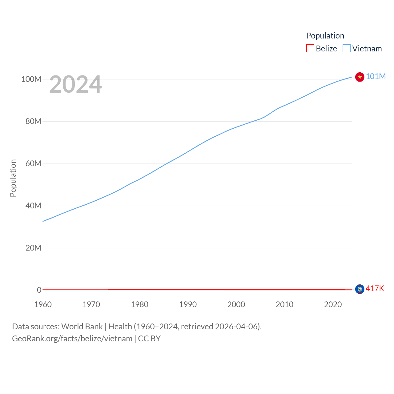 Belize has a population of 417K (ranked 171/197), compared with 101M in Vietnam (ranked 16/197). Belize's land area is 8,807 sq mi versus 121,016 sq mi for Vietnam (ranked 148th vs. 67th).