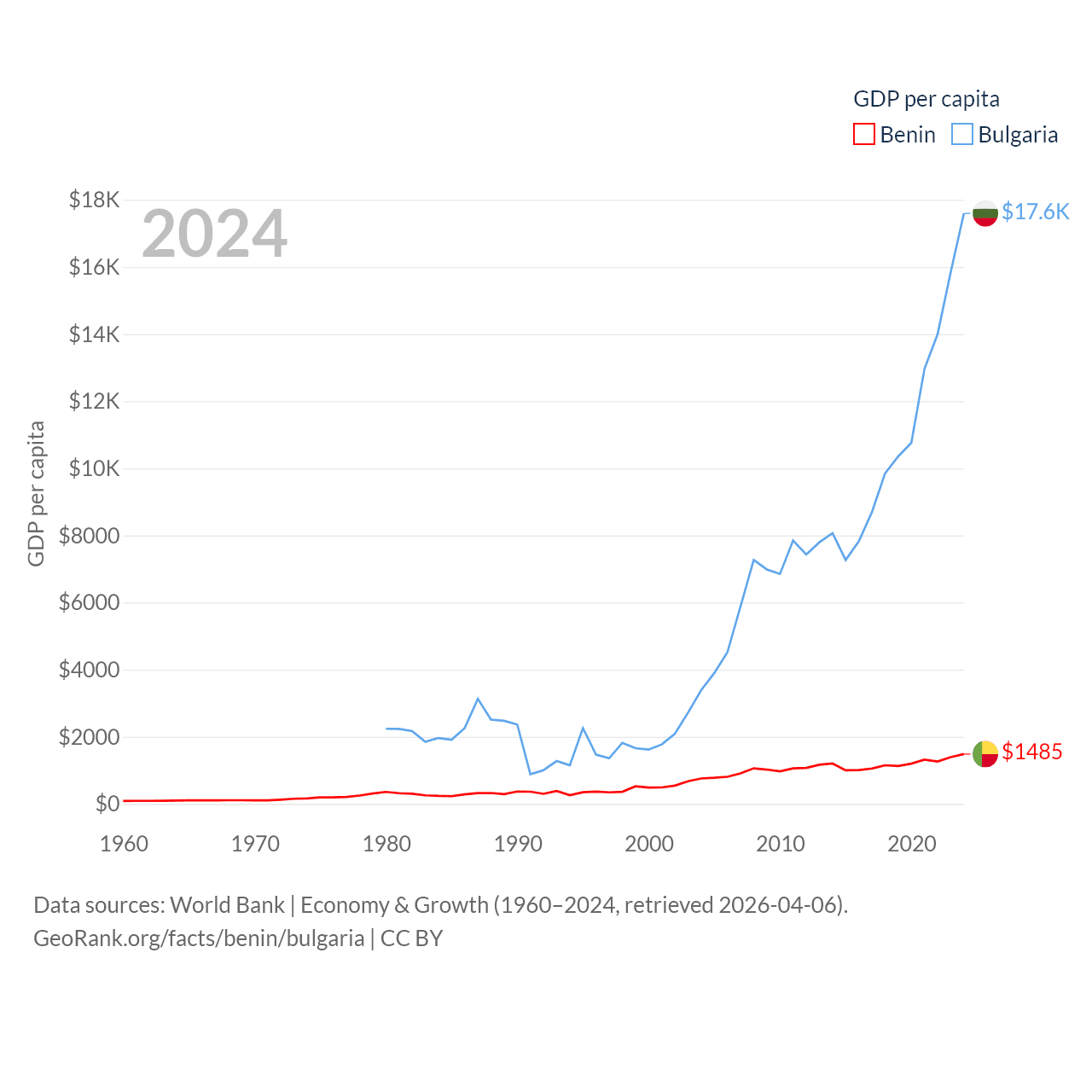 By GDP, Benin ranks 126/197 ($21.5B) and Bulgaria ranks 67/197 ($113B). By GDP per capita, Benin ranks 162/197 ($1,485), while Bulgaria ranks 64/197 ($17,596).