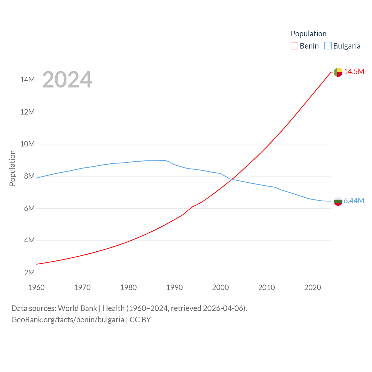 Benin has a population of 14.5M (ranked 76/197), compared with 6.44M in Bulgaria (ranked 110/197). Benin's land area is 43,537 sq mi versus 41,915 sq mi for Bulgaria (ranked 99th vs. 101st).