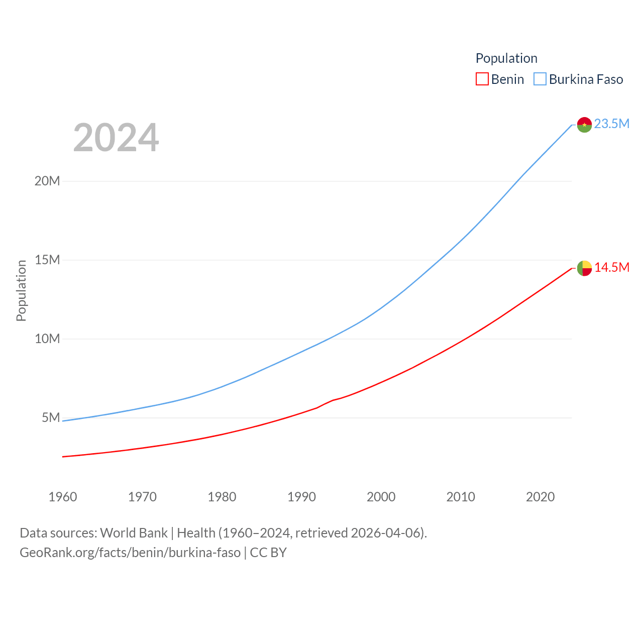 Benin has a population of 14.5M (ranked 76/197), compared with 23.5M in Burkina Faso (ranked 59/197). Benin's land area is 43,537 sq mi versus 105,638 sq mi for Burkina Faso (ranked 99th vs. 73rd).