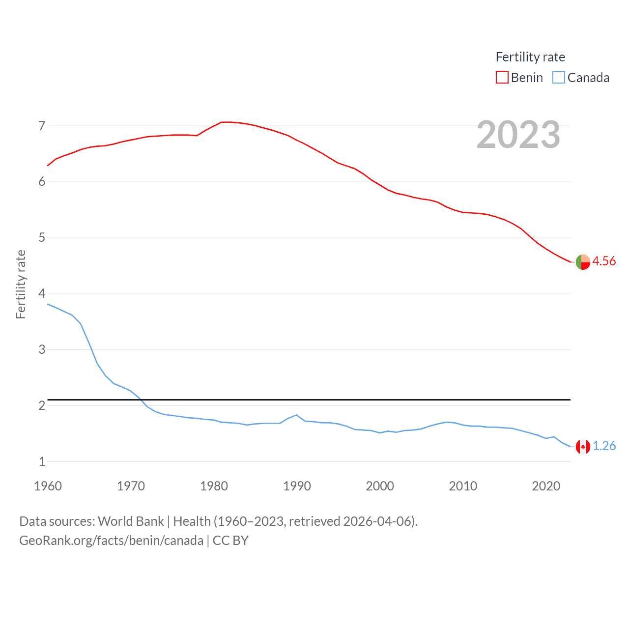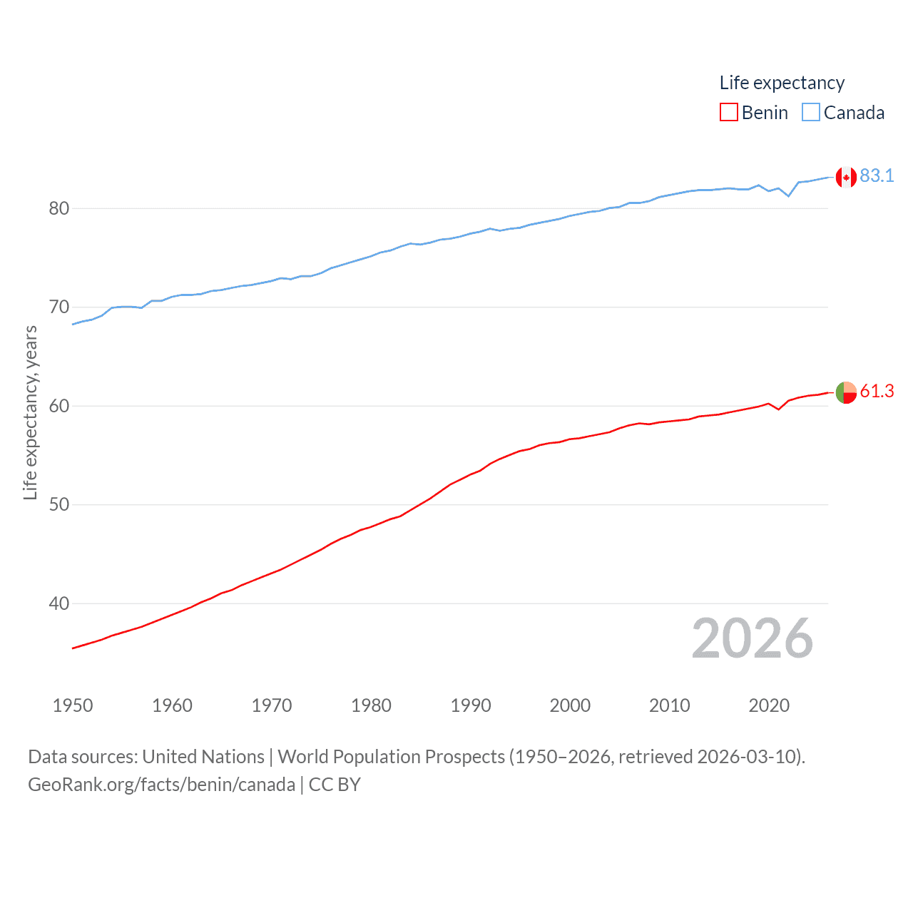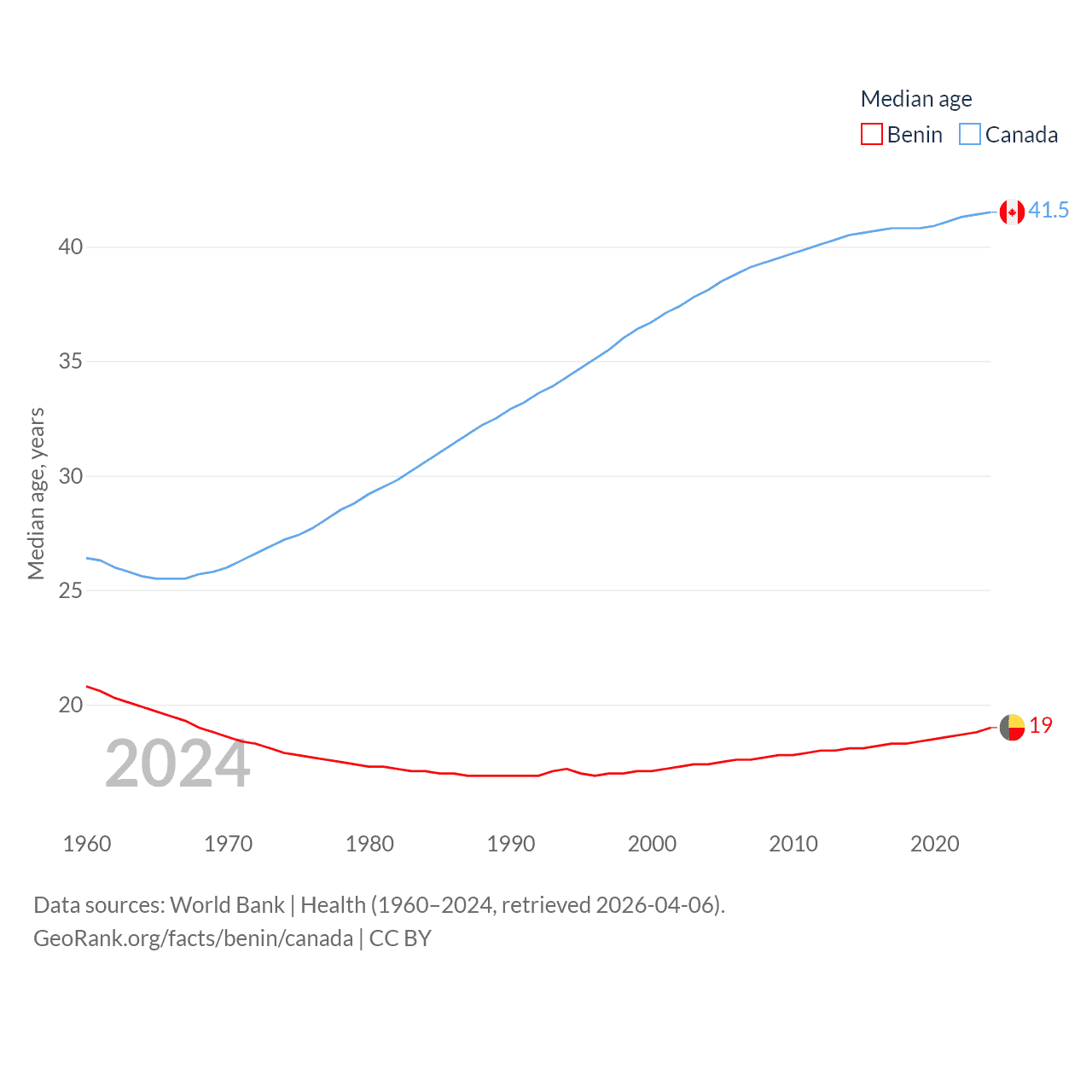 Benin has a population of 14.5M (ranked 76/197), compared with 41.3M in Canada (ranked 37/197). Benin's land area is 43,537 sq mi versus 3,393,336 sq mi for Canada (ranked 99th vs. 4th).