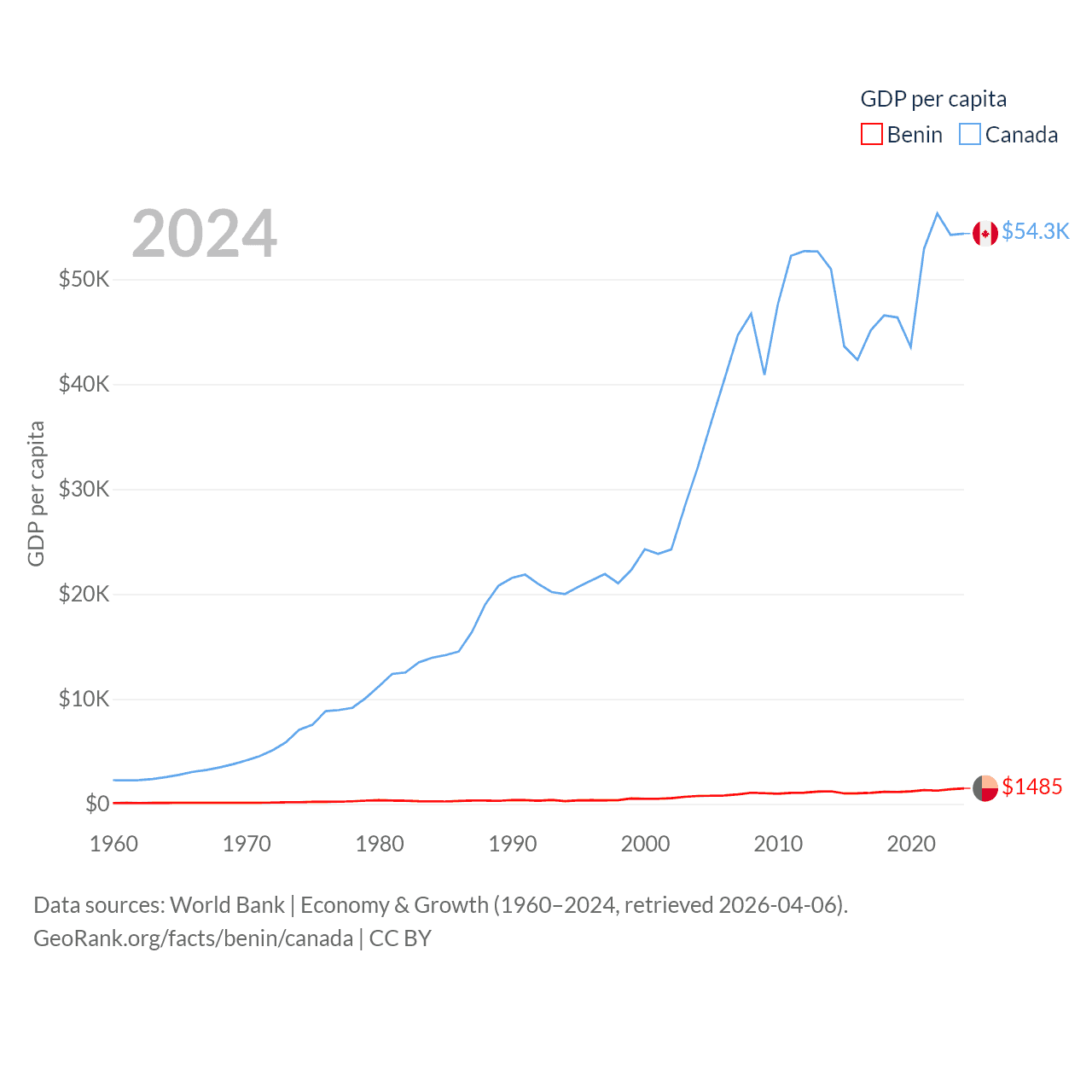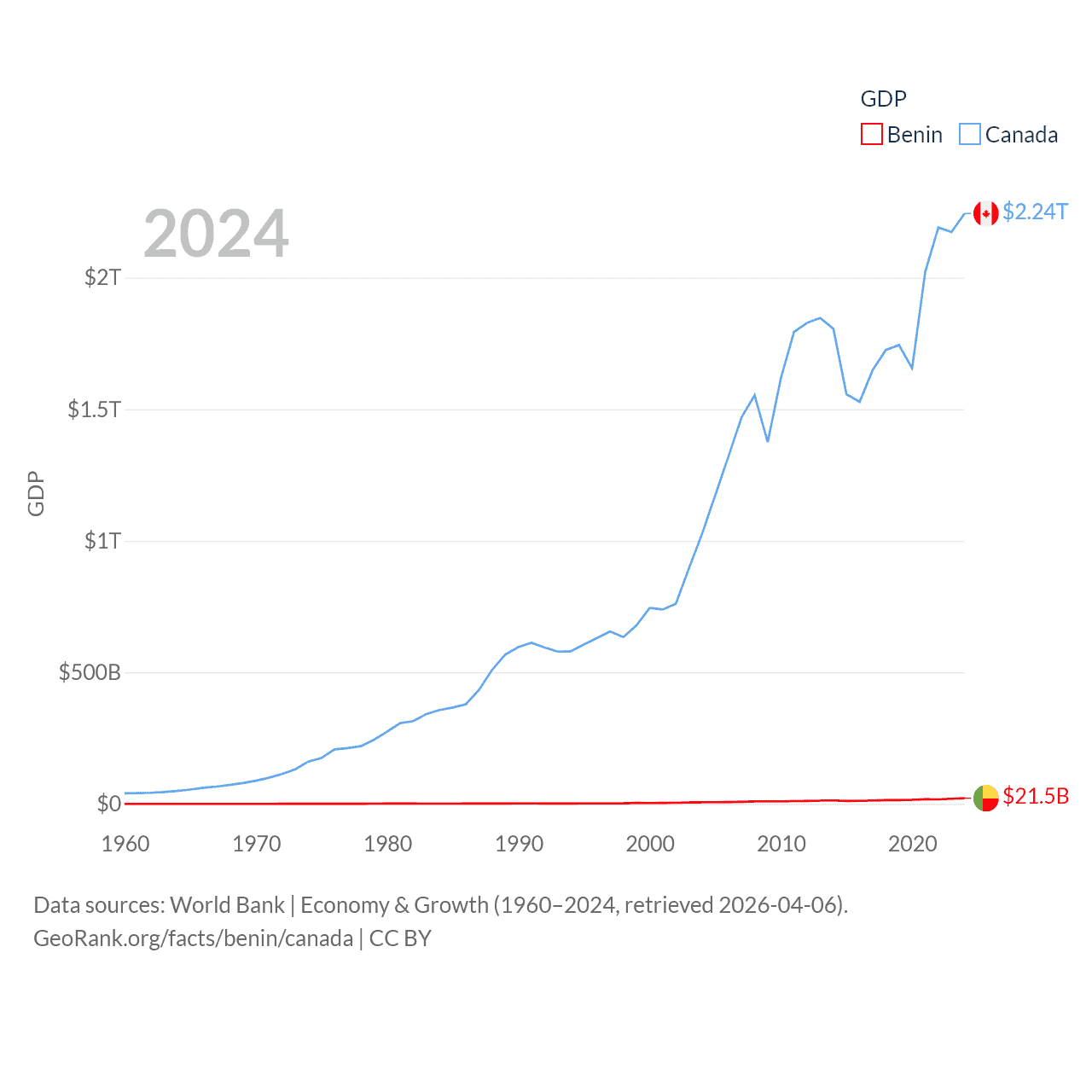 By GDP, Benin ranks 126/197 ($21.5B) and Canada ranks 9/197 ($2.24T). By GDP per capita, Benin ranks 162/197 ($1,485), while Canada ranks 20/197 ($54,340).
