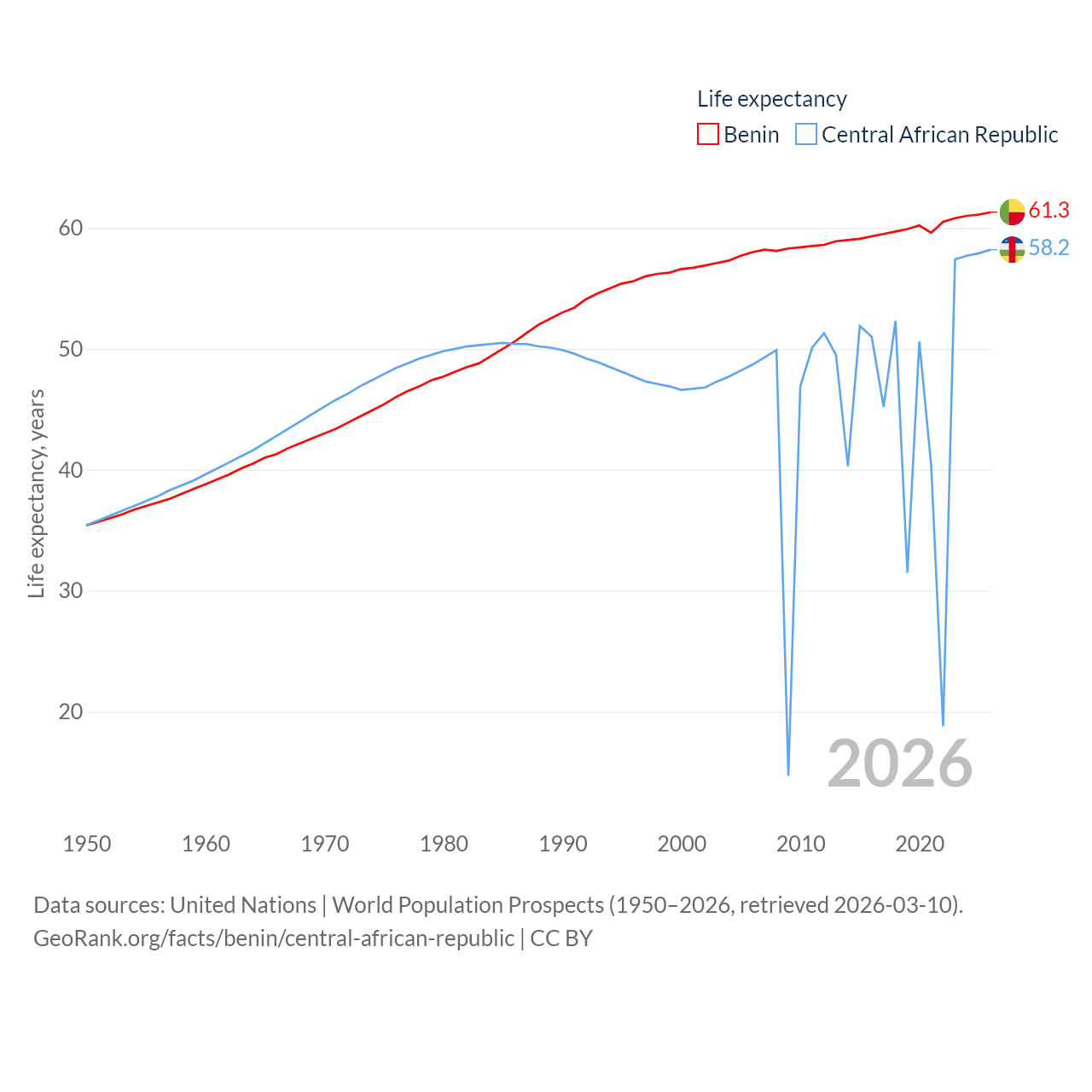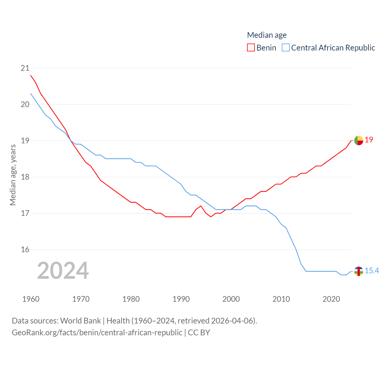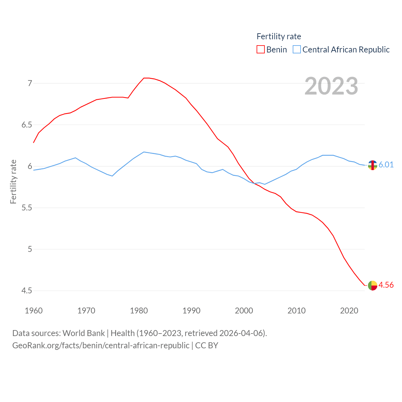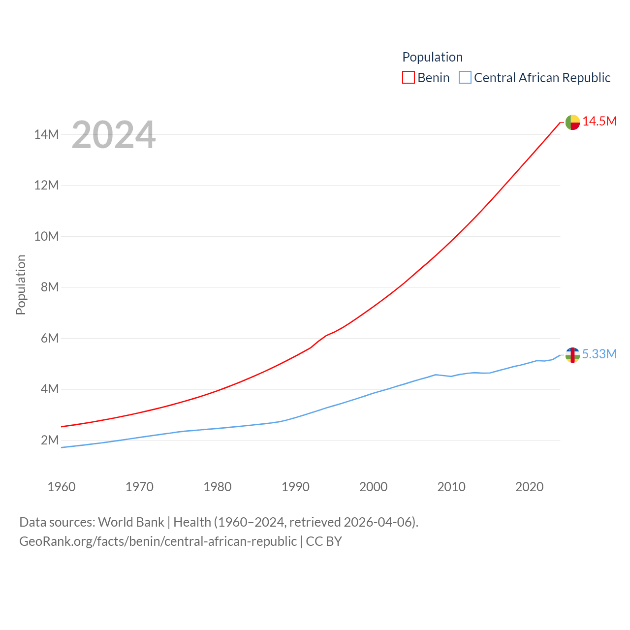 Benin has a population of 14.5M (ranked 76/197), compared with 5.33M in The Central African Republic (ranked 121/197). Benin's land area is 43,537 sq mi versus 240,534 sq mi for The Central African Republic (ranked 99th vs. 43rd).