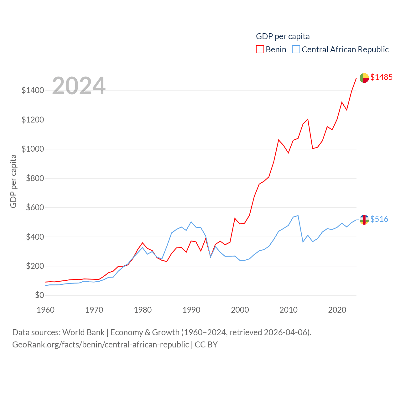 By GDP, Benin ranks 126/197 ($21.5B) and The Central African Republic ranks 171/197 ($2.75B). By GDP per capita, Benin ranks 162/197 ($1,485), while The Central African Republic ranks 195/197 ($516).