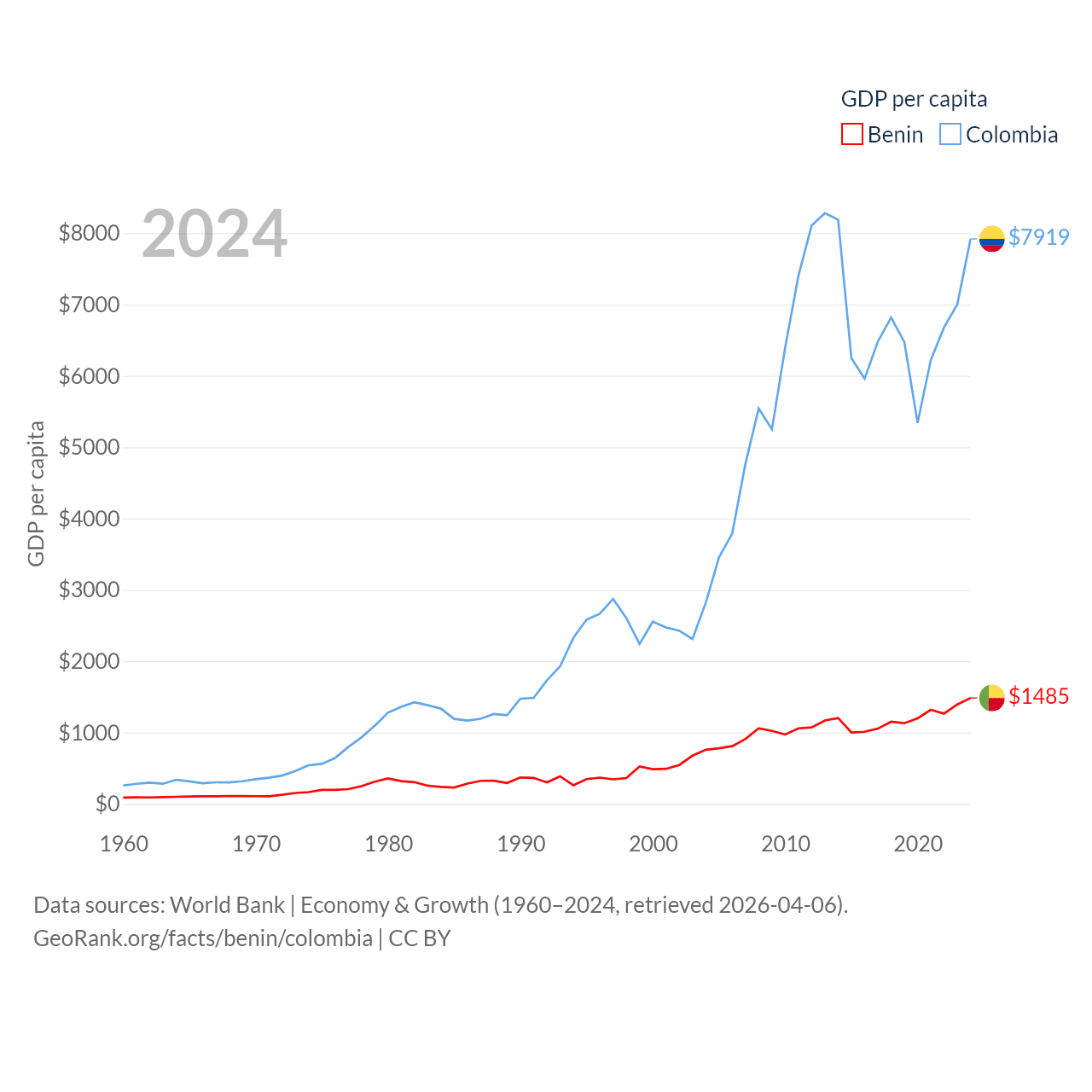 By GDP, Benin ranks 126/197 ($21.5B) and Colombia ranks 39/197 ($419B). By GDP per capita, Benin ranks 162/197 ($1,485), while Colombia ranks 94/197 ($7,919).