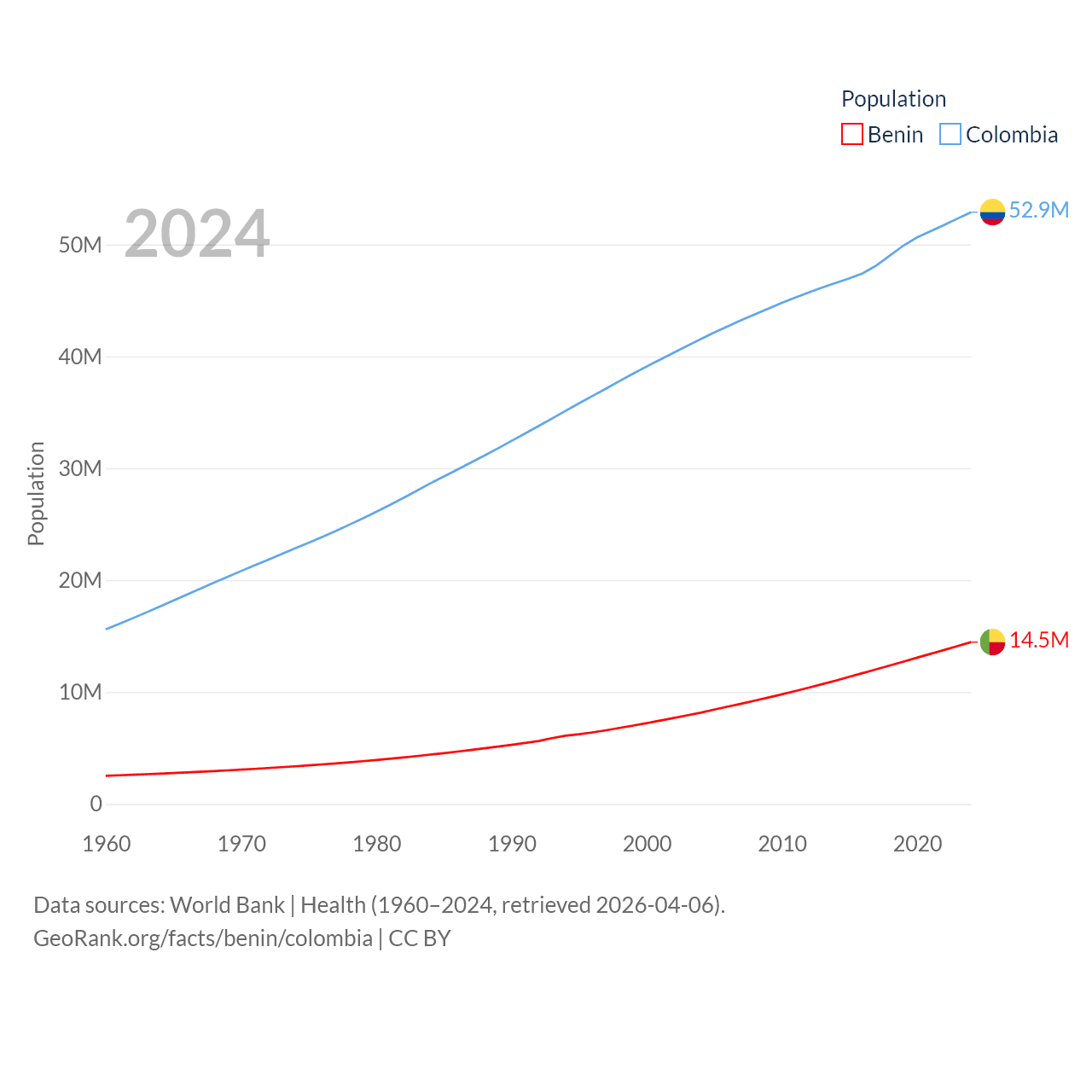 Benin has a population of 14.5M (ranked 76/197), compared with 52.9M in Colombia (ranked 28/197). Benin's land area is 43,537 sq mi versus 428,380 sq mi for Colombia (ranked 99th vs. 26th).